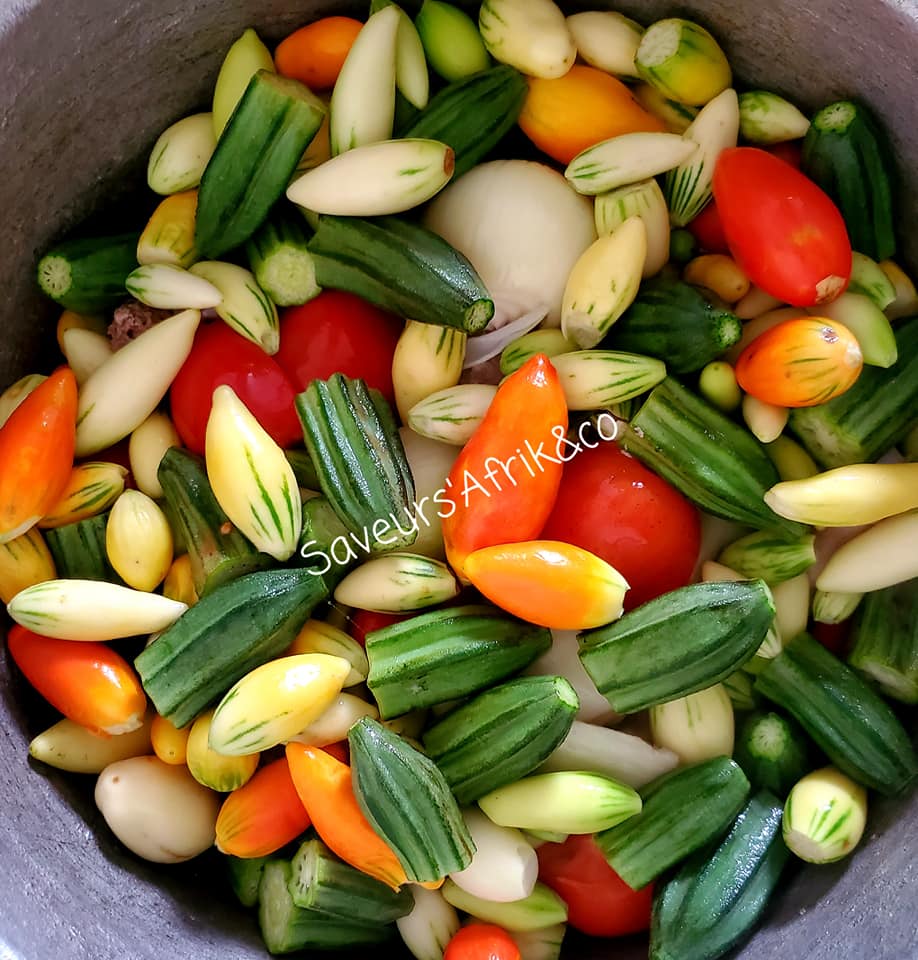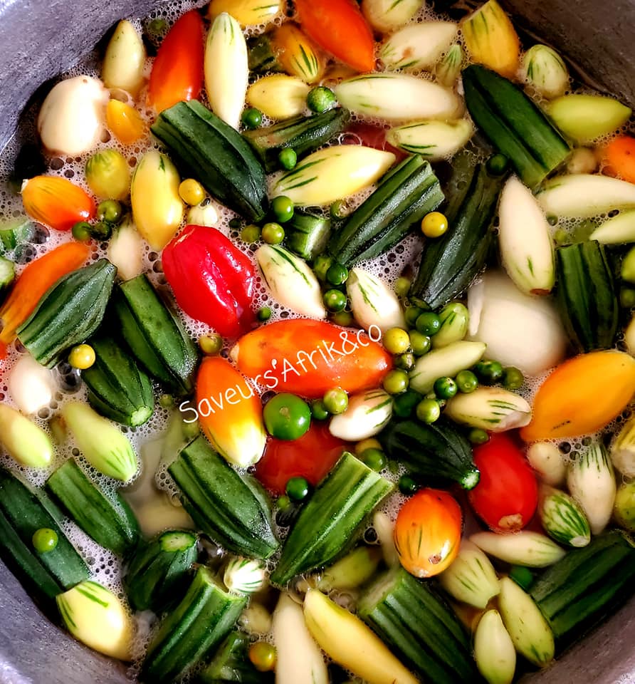 - Puis, ajouter les aubergines nettoyées, la tomate, le gnangnan, le gombo, l’oignon, le piment frais, l’huile