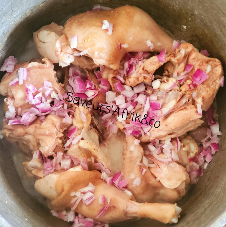 - Saler et ajouter un peu d’eau avec un demi oignon découpé en dès. Laisser bouillir pendant 10 min.