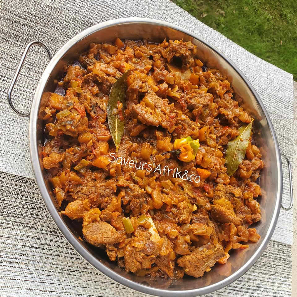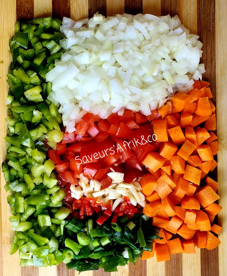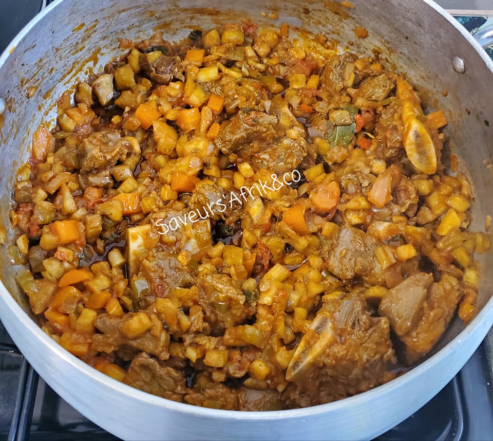 - Faire revenir avec les morceaux de viande dans un filet d’huile. Ajouter y les ingrédients : oignon, tomate, ail, carottes, piment frais, feuilles d’oignons, poivron découpés en dés. Ajouter un verre d’eau, la tomate pâte et laisser mijoter pendant 10 min.