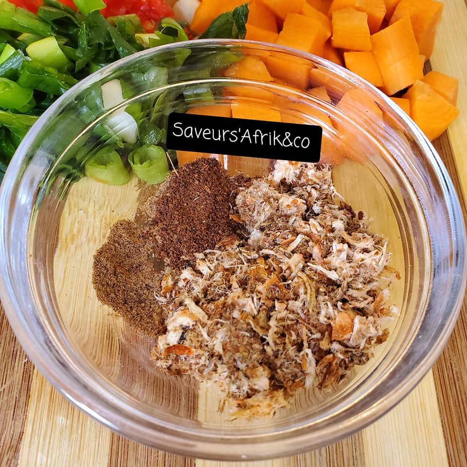 - Ajouter les crevettes séchées, la poudre d’oignon et le fêfê et rectifier l’assaisonnement, puis laisser mijoter à feu doux pendant 10 min.