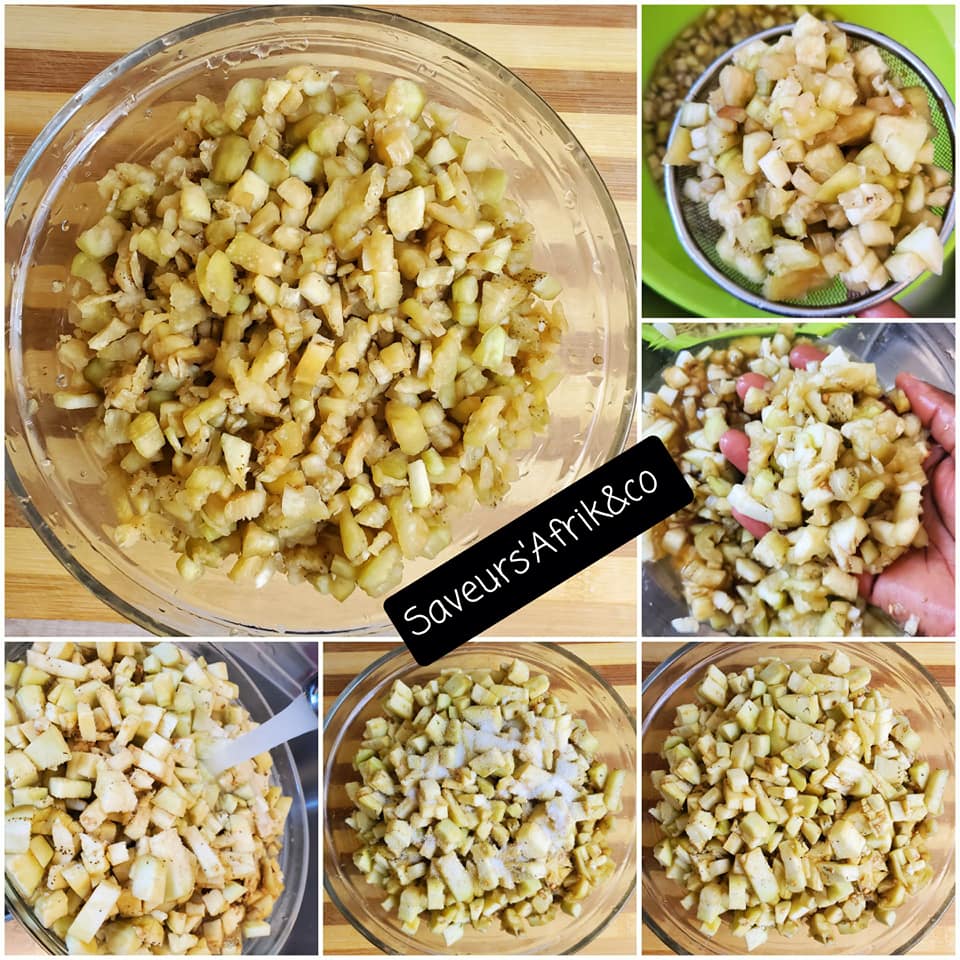 - Pendant ce temps, laver les aubergines. Puis, les éplucher et les découper en dés. Puis, verser sur les aubergines, du laurier, du sel, puis de l’eau en malaxant bien à l’aide de vos mains. Rincer à l’eau claire une seconde fois, puis laisser essorer pendant 5 min.