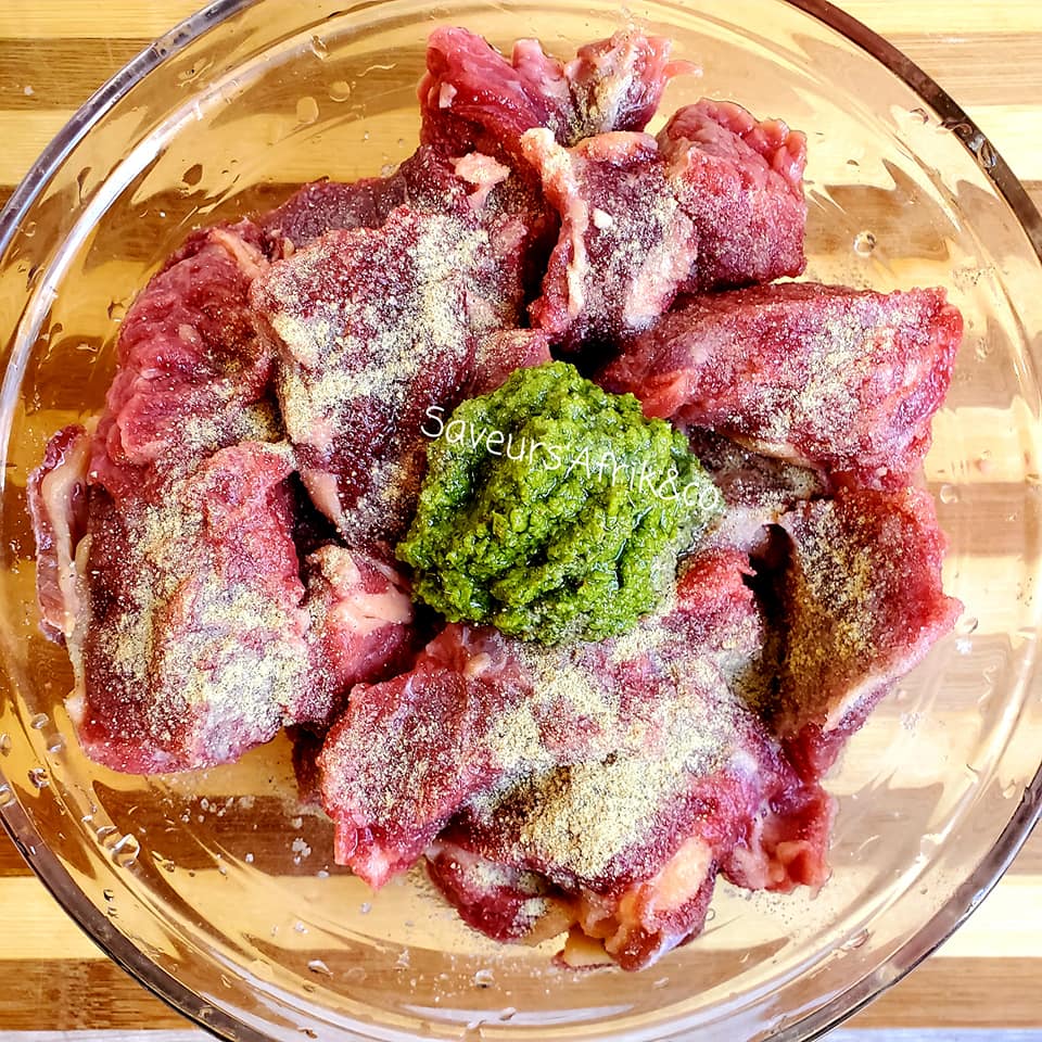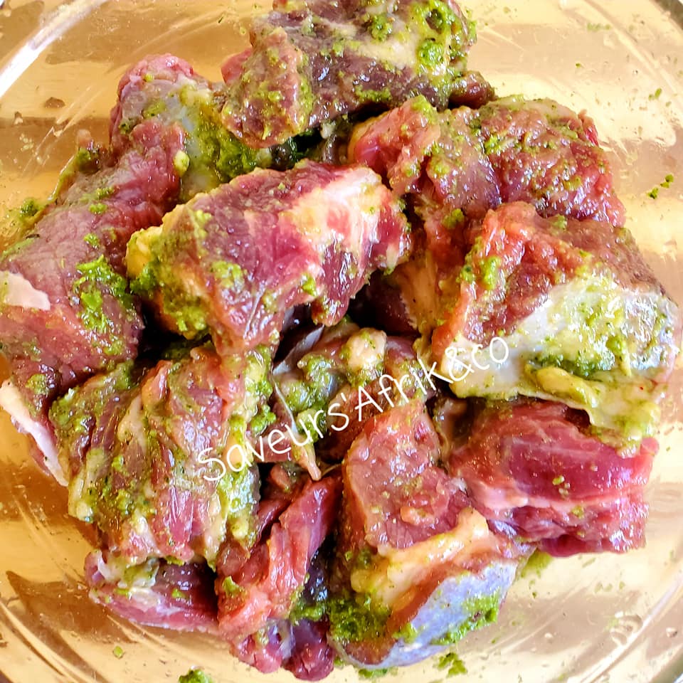 - Laver avec du citron la viande, puis les decouper en morceaux, saler et mariner avec du persil, ail et poivre. Mettre dans une casserole et laisser bouillir pendant 10 min.