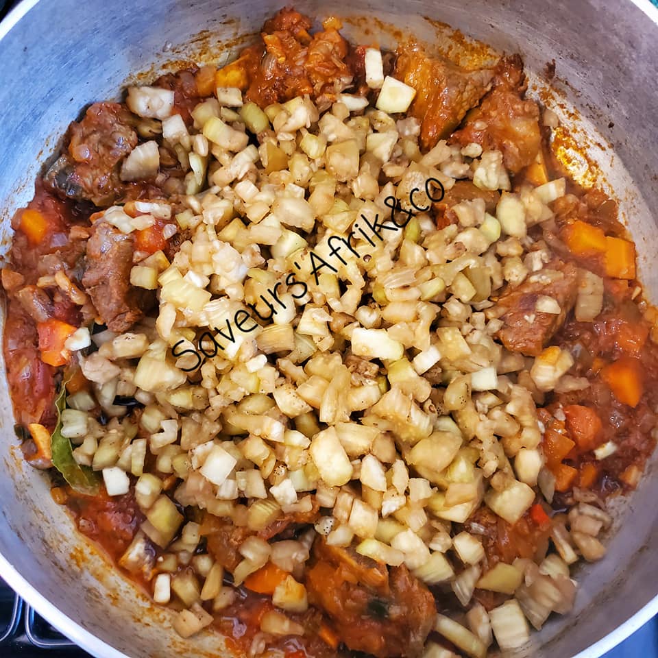 - Ensuite ajouter les aubergines à la viande, puis bien mélanger et ajouter un verre d’eau et un piment frais entier. Puis, laisser mijoter environ 15 min tout en remuant régulièrement.