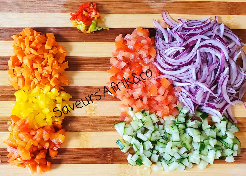 En accompagnement, vous avez de l’attieké, de la salade de crudités. Des poivrons poêles, du piment rouge, vert.