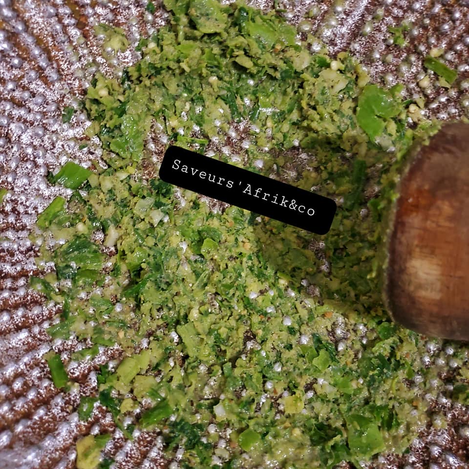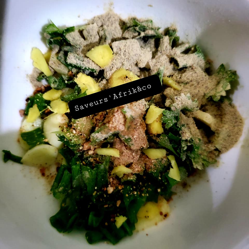 - Écraser le persil, la ciboulette, gingembre, l’ail, crevettes séchées avec le poivre et la rondelle.