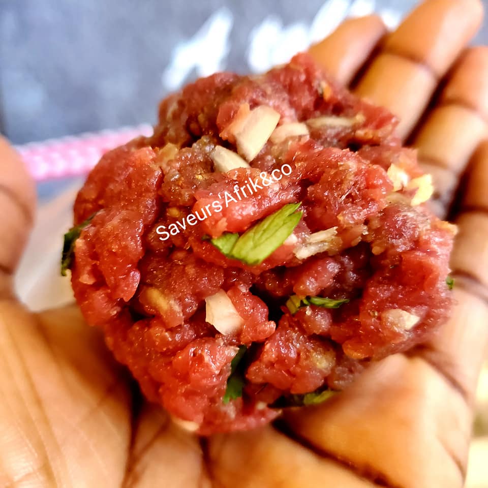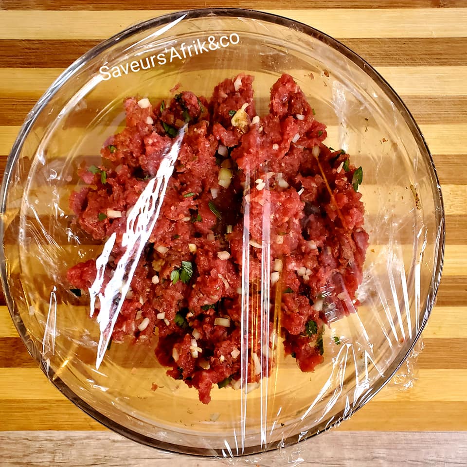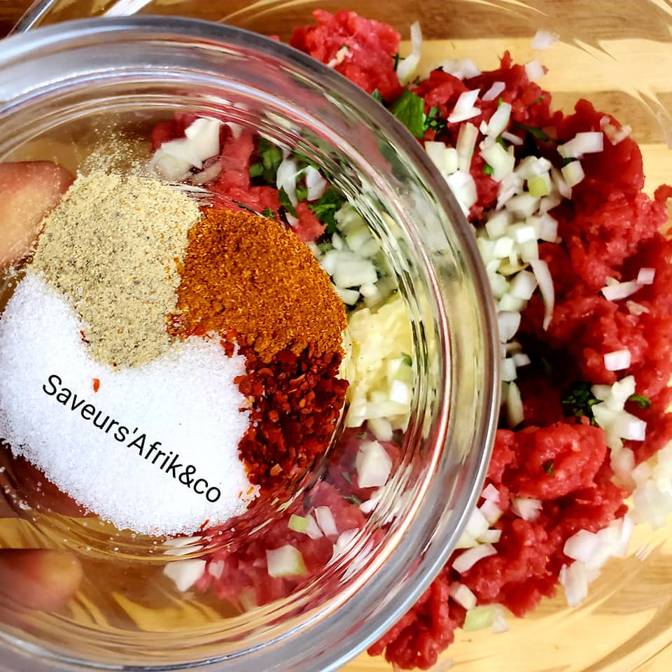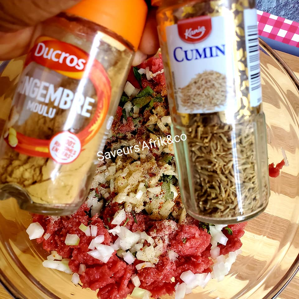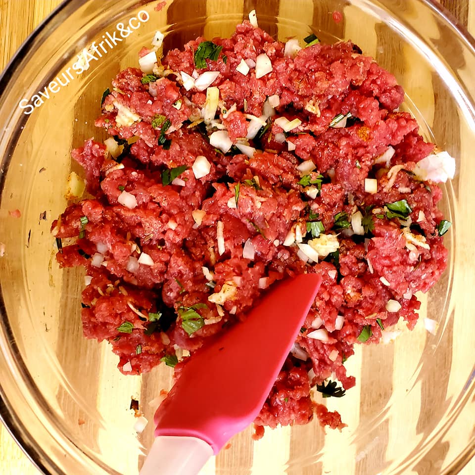 - Commencez par mettre la viande dans un saladier, ajoutez-y tous les herbes, l’oignon, les épices(gingembre, cumin, poivre, paprika etc.), salez et bien malaxer avec une spatule ou avec les doigts afin que la viande s’imprègne bien des herbes et des épices.