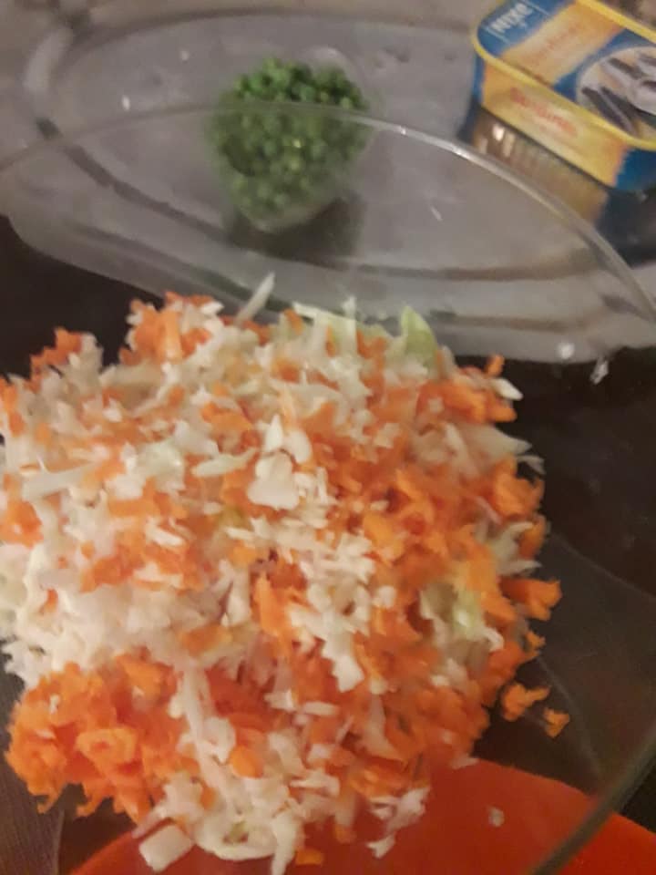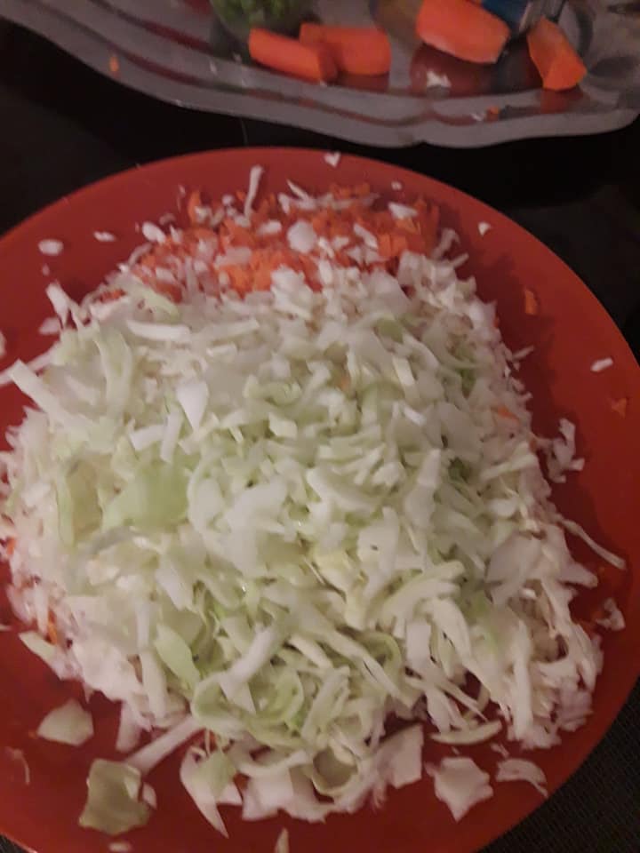 - Râpez le choux et les carottes(en lamelle fine), couper en dés la tomate et poivron, découper les oignons
