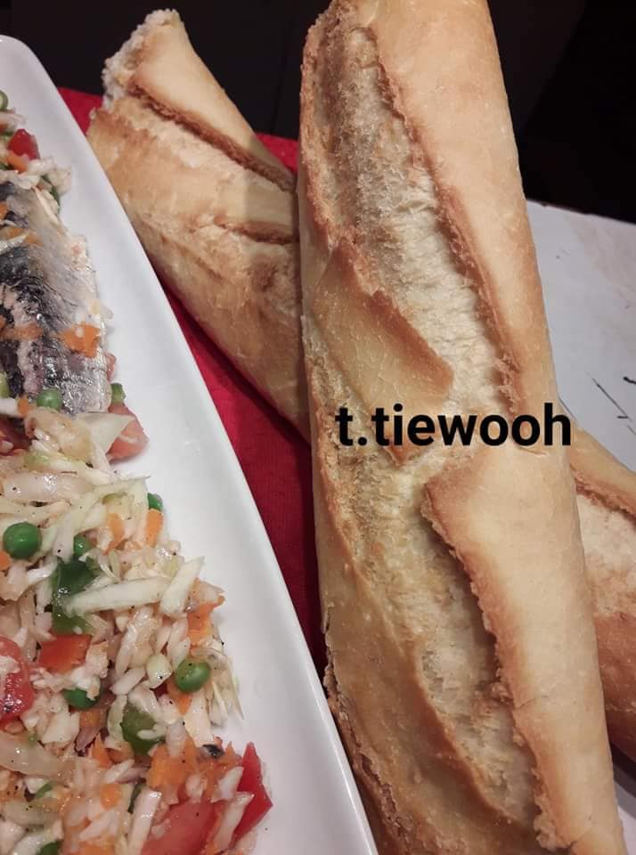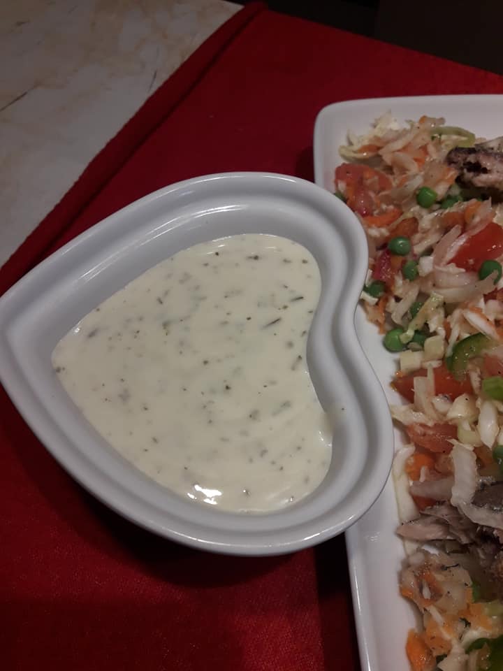 - Faites une sauce avec du vinaigre, du poivre, ail, mayonnaise,huile, un peu de sel et une pointe de sucre.