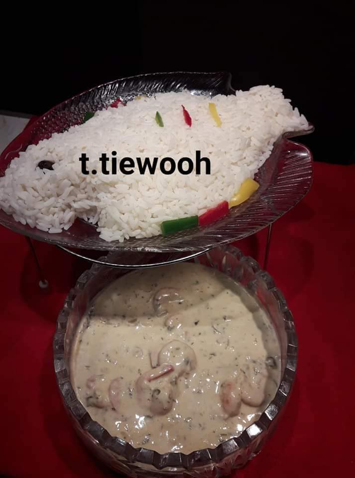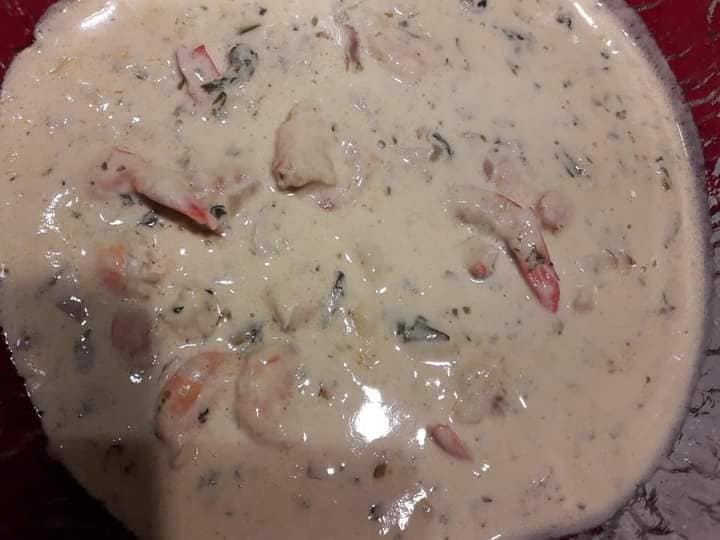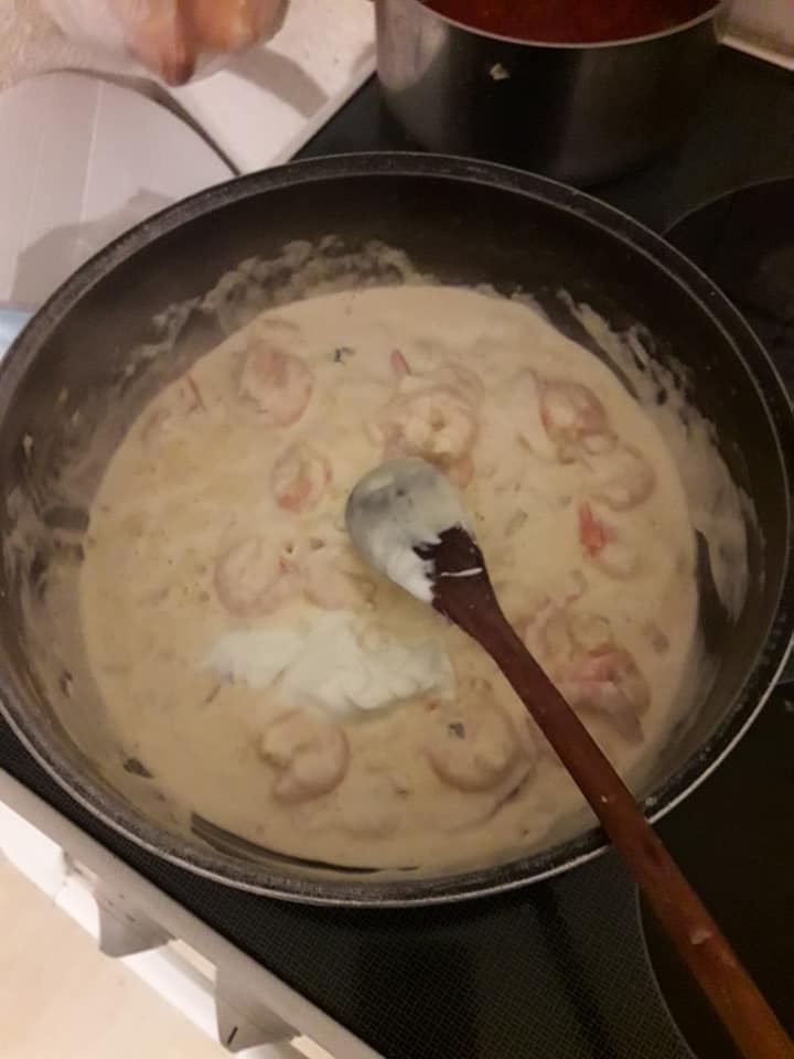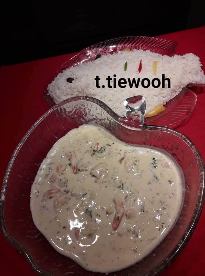 - Blanchir les oignons dans une cuillère d’huile sans les roussir, ajouter les crevettes les faire dorer en remuant sans cesse même pendant 15 mn, ajouter, le persil ail et poivre remuer , ajouter la crème fraîche et continuer la cuisson à feu doux, assaisonner à votre convenance, sel ou cube, laisser mijoter sans trop l’épaissir pendant 10 mn, au besoin vous pouvez ajouter une dose d’eau car la sauce ne doit pas être trop épaisse.