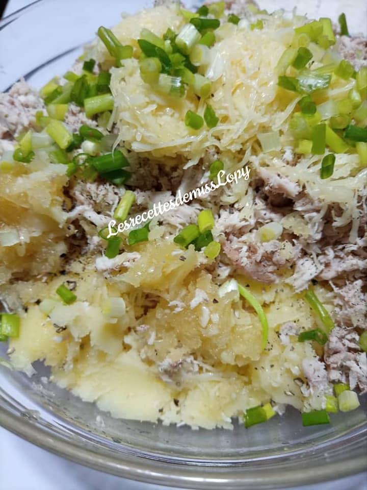 - Dans un saladier , mettre la purée de pomme de terre le poulet haché le fromage et le reste des épices de l’ail les échalotes et l’oignon vert finement haché. Bien mélanger l’ensemble.