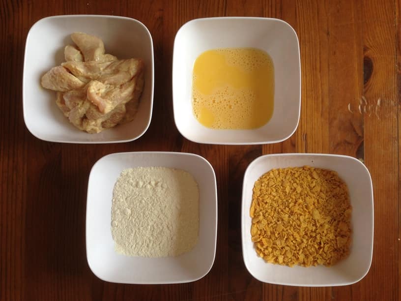 - Dans un premier bol, mettez la farine. Dans un deuxième les œufs battus et dans le dernier les corps flakes grossièrement écrasé à la main, le sel, le piment.