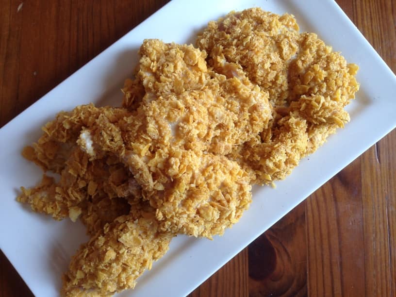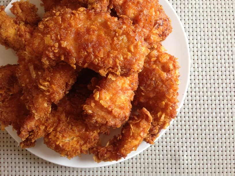- Faites chauffer votre huile de friture, prenez un morceau de poulet passez le dans la farine, ensuite dans les œufs puis dans les corn flakes. Vous pouvez remettre dans les œufs puis dans les corn flakes à nouveau.
