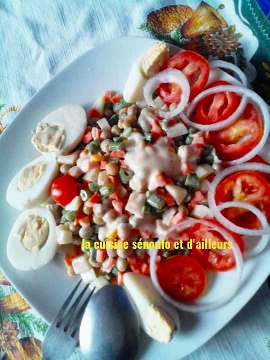 - Mettre dans un bol les morceaux de pommes de terre et les haricots vert précuits, la carotte cru, le petit poids,la poignée de maïs,ajouter la vinaigrette et mélanger.