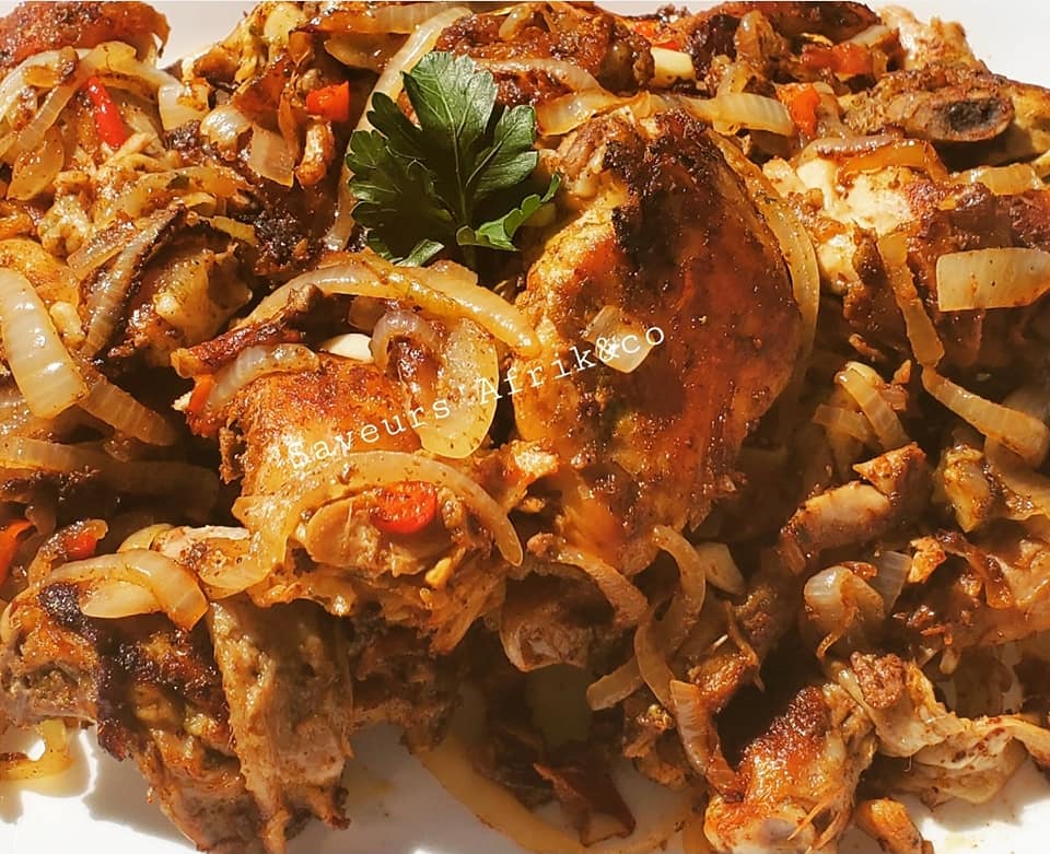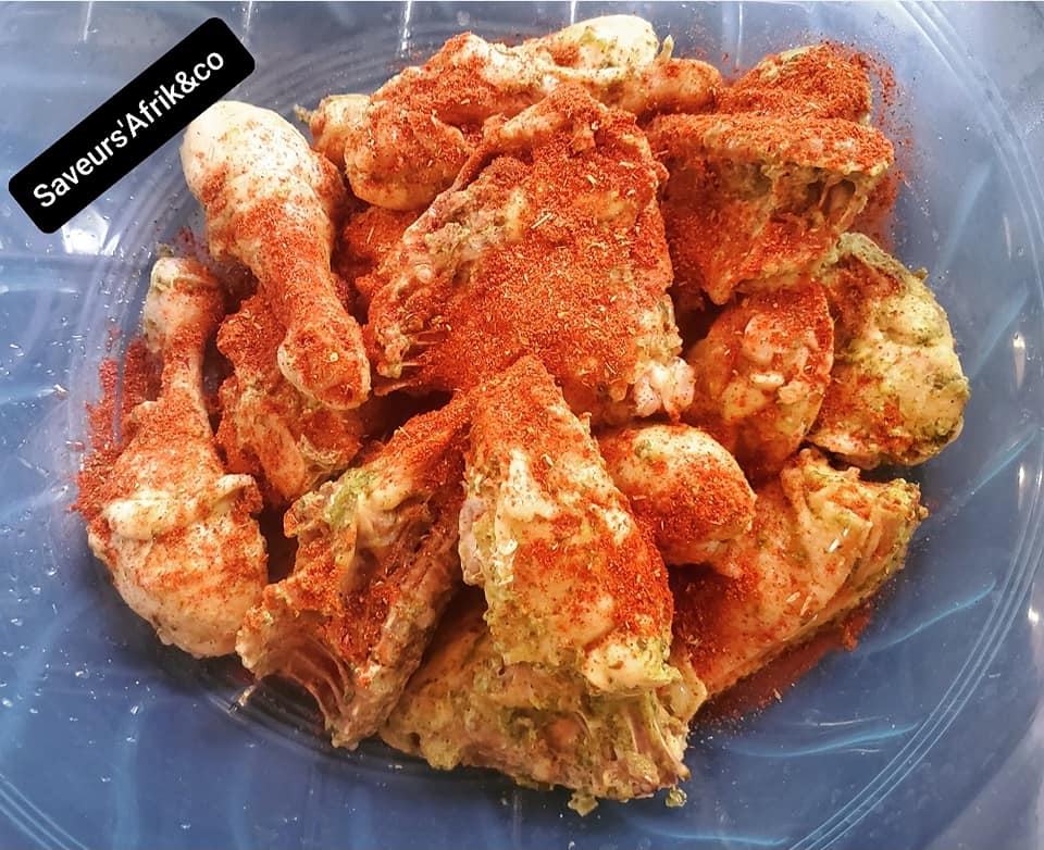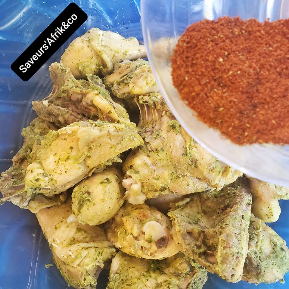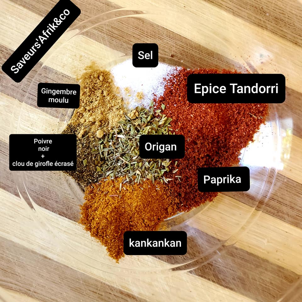 - Dans un saladier, ajouter le poulet et bien mariner avec les épices suivants : poivre noir, clou de girofle, 1 c.a.c de kankankan, paprika, épice massala Tandoori, origan, gingembre en poudre, sel et laisser reposer pendant 10 minutes