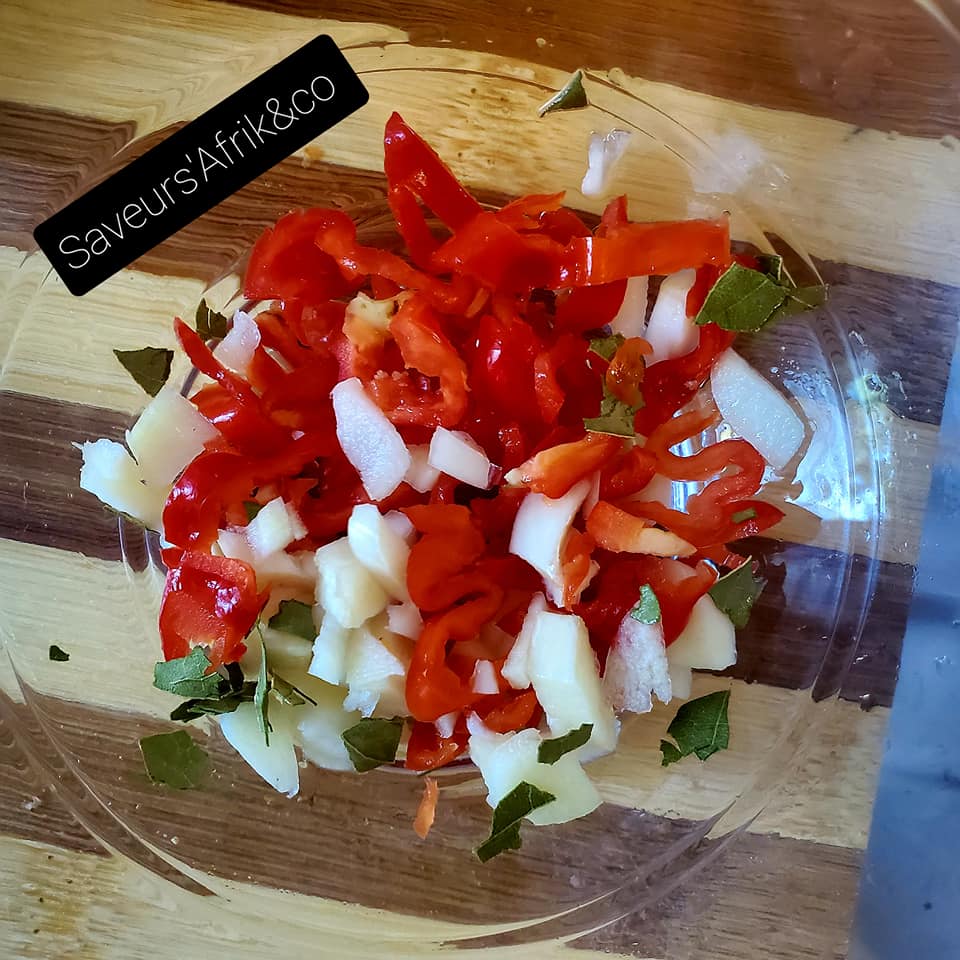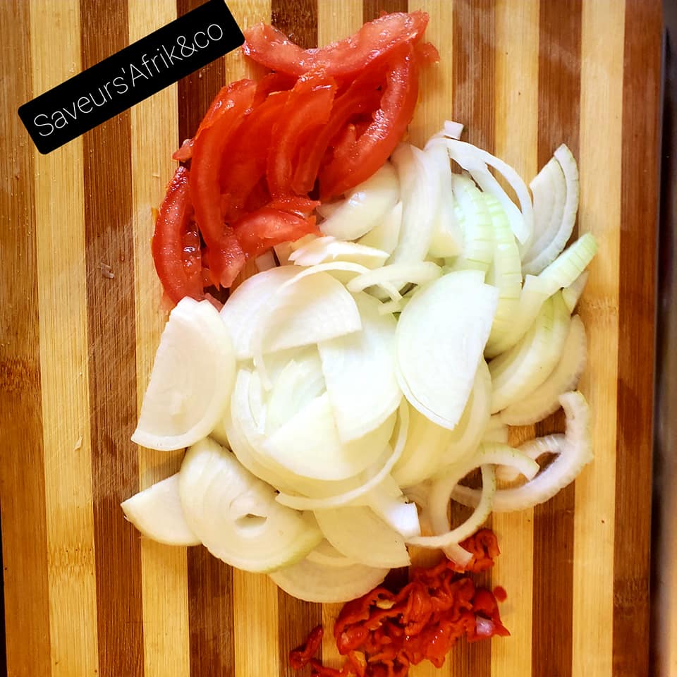 - Nettoyer vos légumes (oignons, piment, ail et tomates ) et découpez les en fines lamelles, puis réserver.