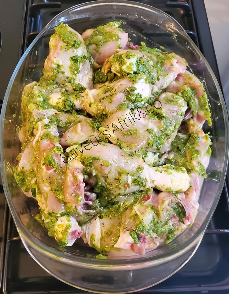 - Mariner le poulet avec la marinade verte et couvrir de cellophane alimentaire (film transparent ), mettre au réfrigérateur pendant toute la nuit de préférence afin que le poulet s’imprègne bien de la marinade.(ou 4h si vous n’avez pas le temps)
