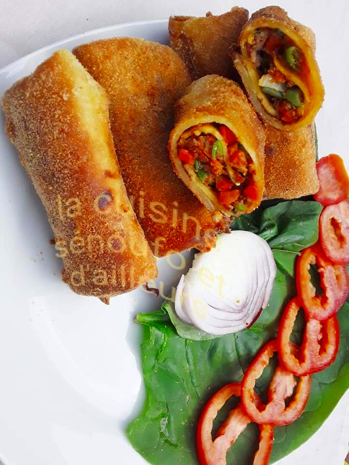 2. Etaler la crêpe mettre 1cuillère à soupe de farce dedans ( placer en bas) et refermer du côté droit et gauche de la crêpe avant de rouler ça du bas vers le haut comme un nem.