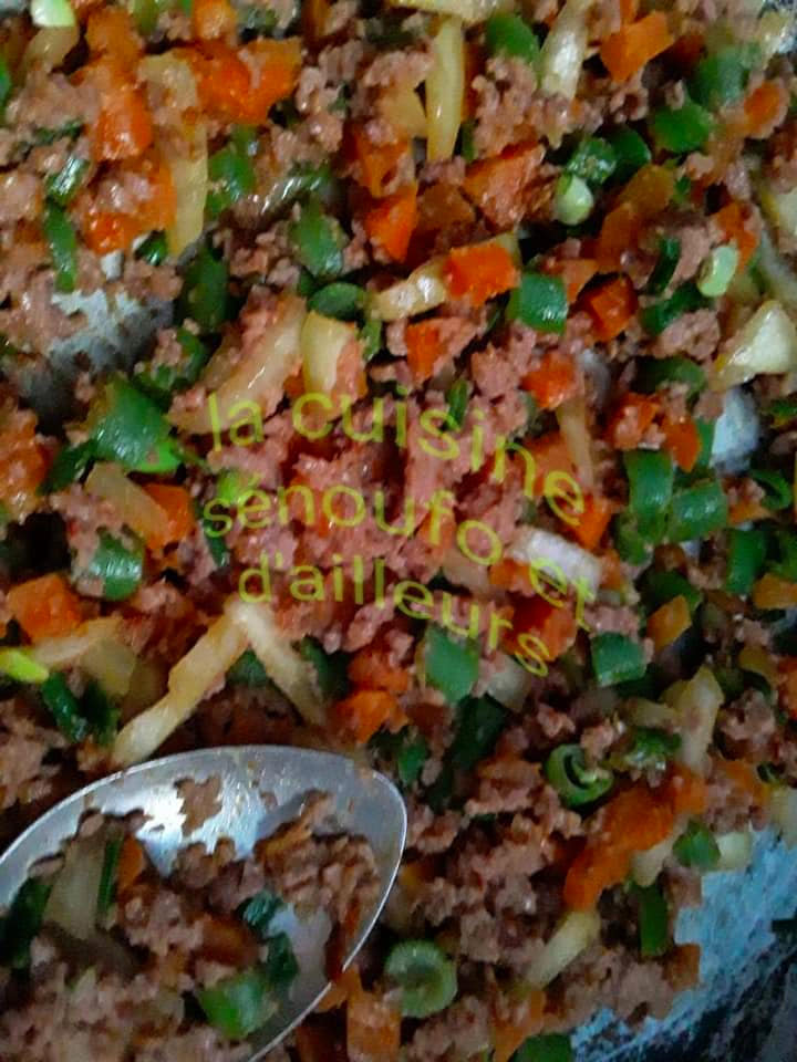 2. Mettre les haricots verts ,carottes ,viande hachée pincée de sel dans la poêle avec 2cuillères à soupe d’eau .