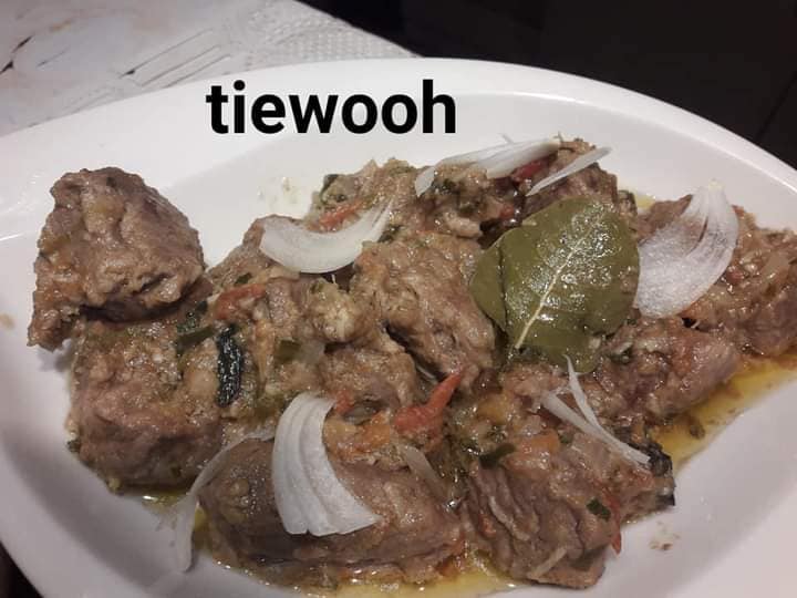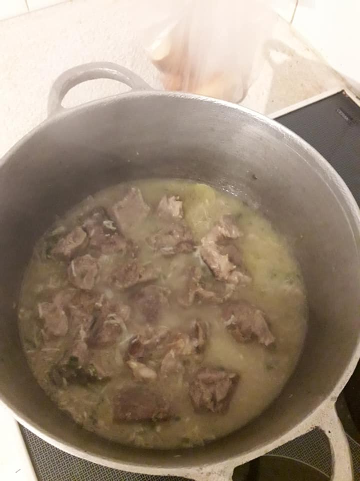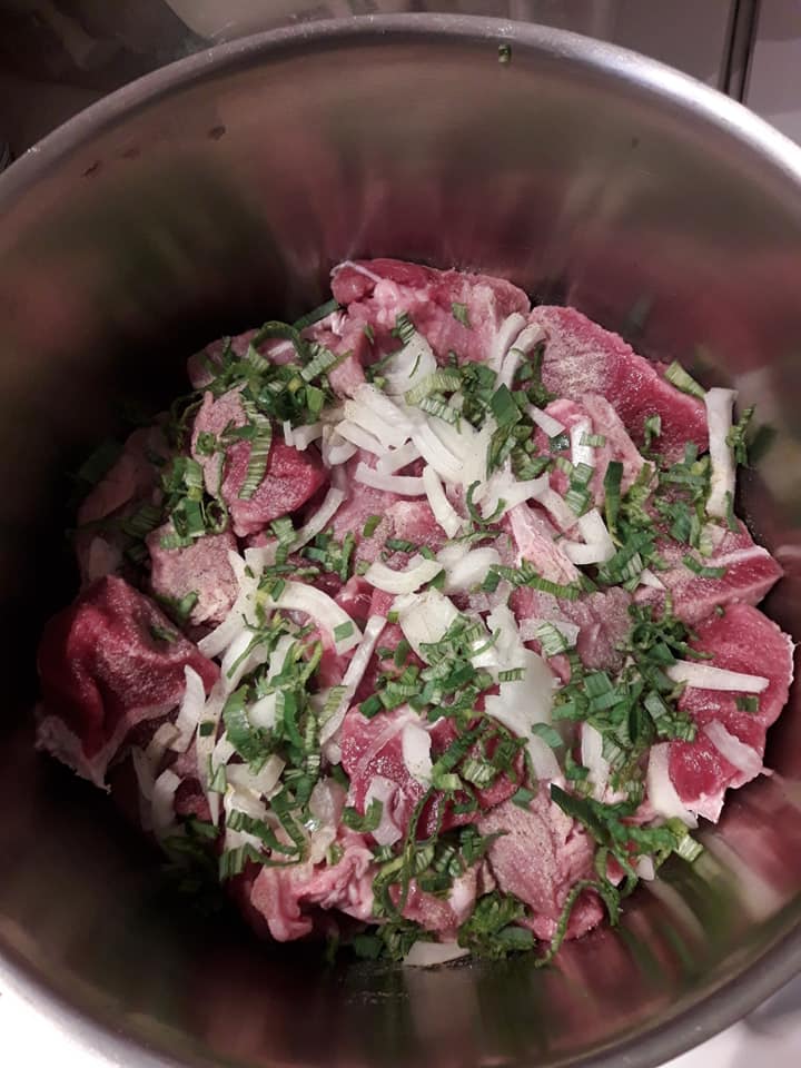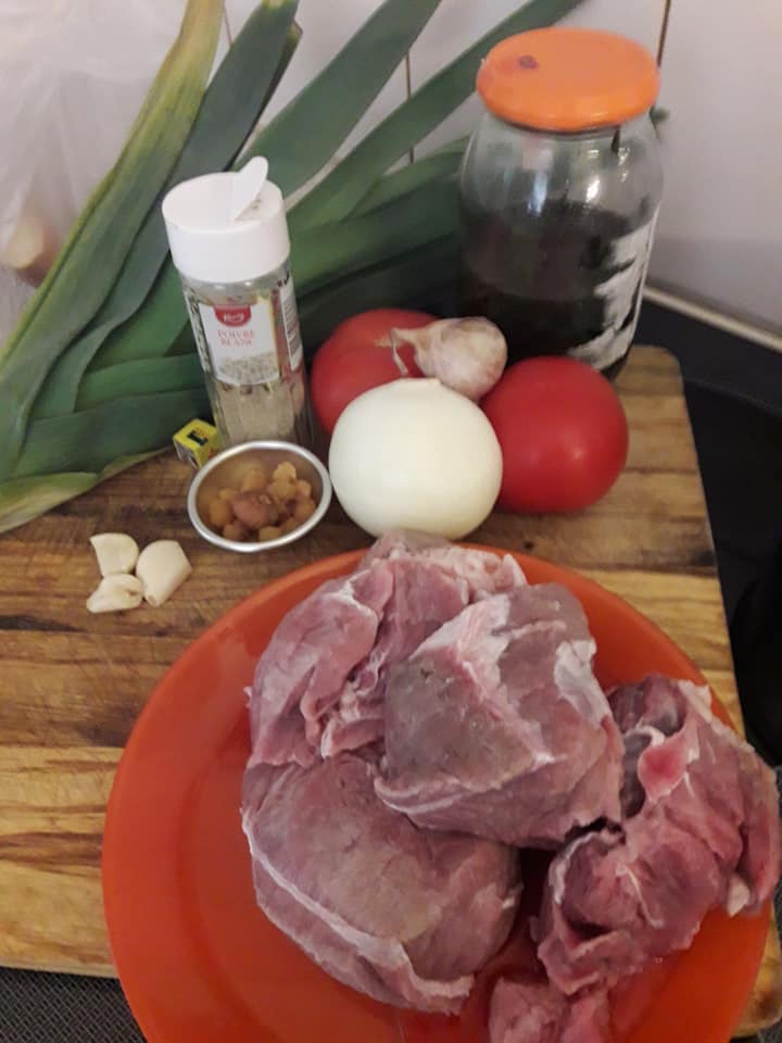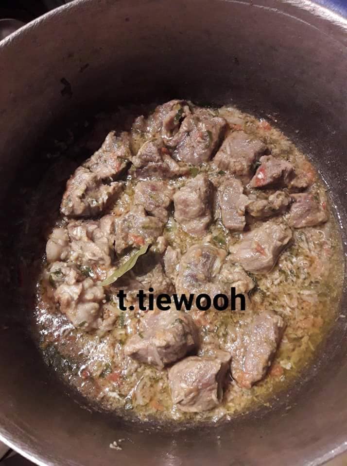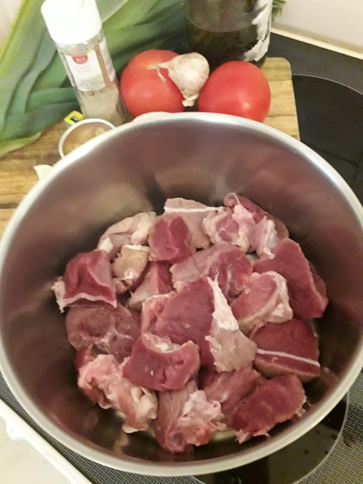 - Découper la viande la rincer et la mettre à cuire dans une cocotte avec oignon, sel et blanc de poireau haché, la cuire à moitié égoutter en gardant son jus de cuisson