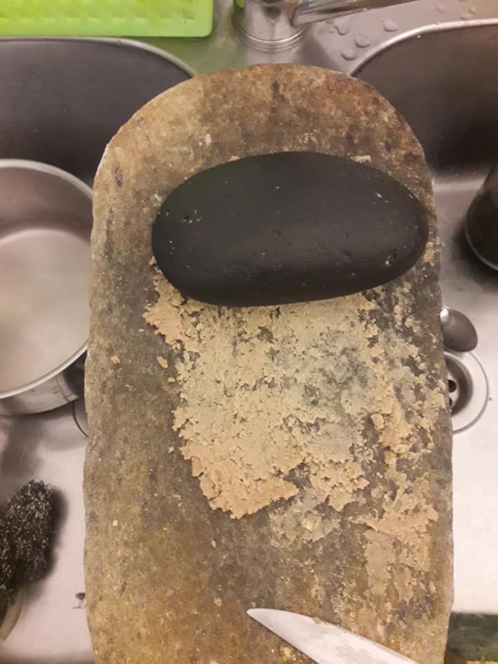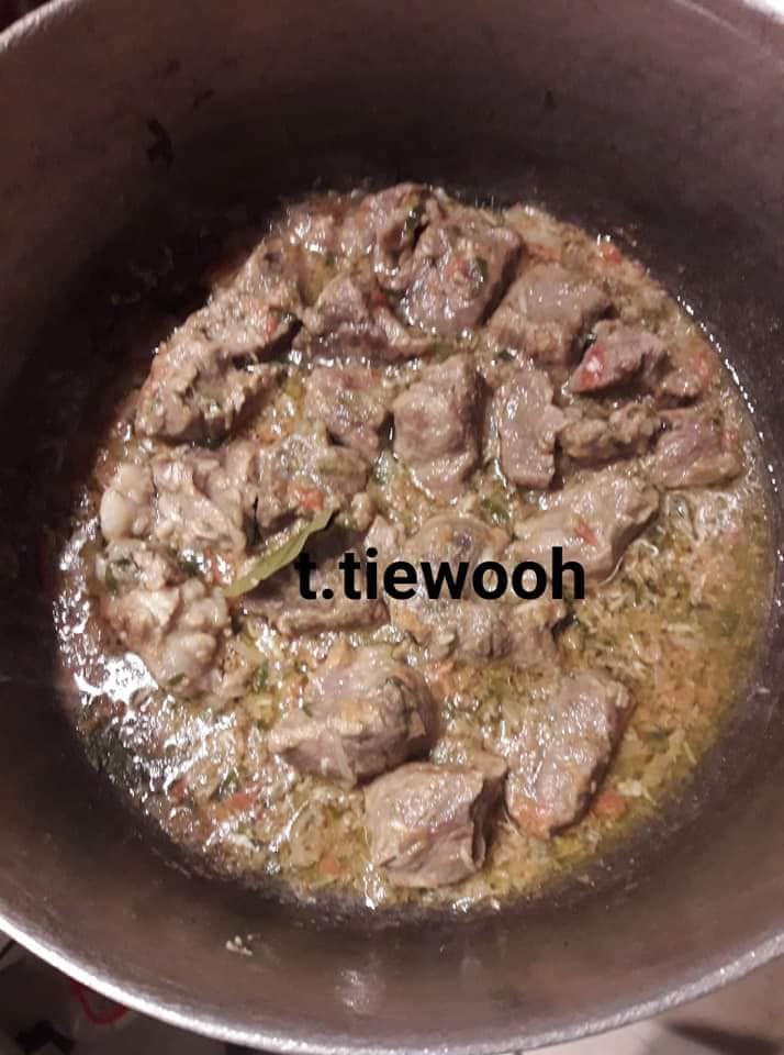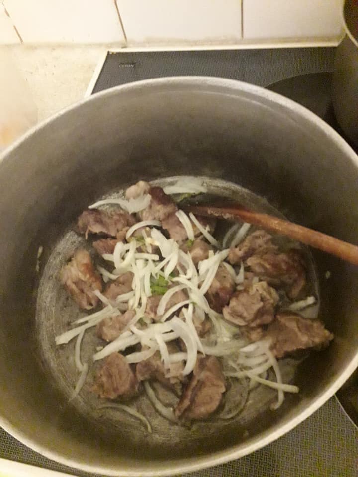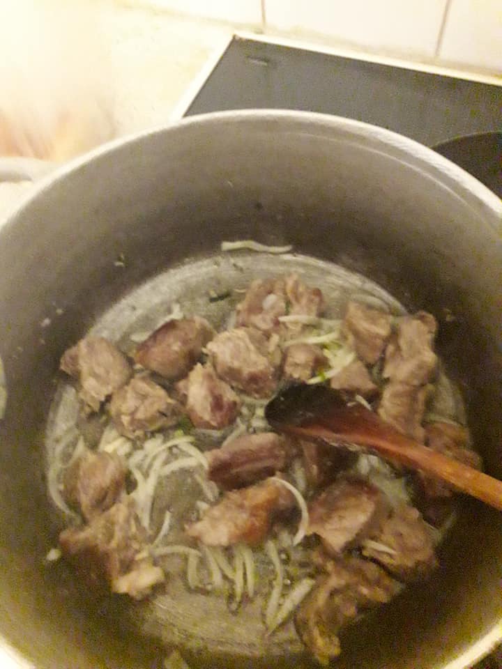- Blanchir les oignons avec un peu d’huile, ajouter la viande, la faire dorer de tous les cotes, ajouter les condiments écrasé avec un peu le jus de cuisson de viande,