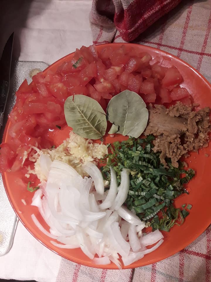 - Ecraser ail un peu oignon , poivre, rondelle et djansan, découper finement poireau et tomate et basilic