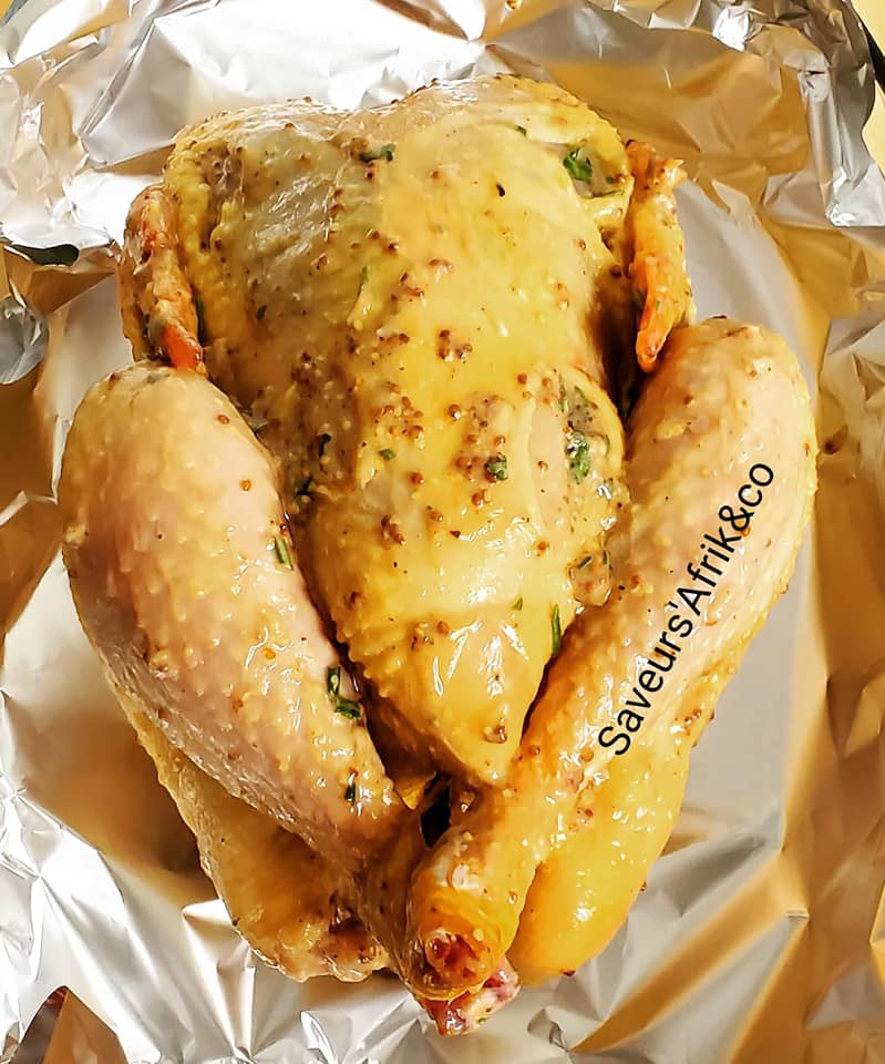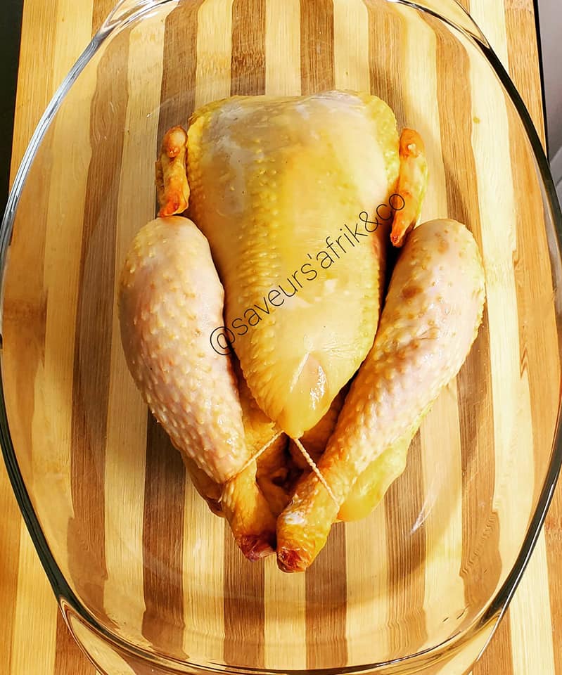 - Préchauffez le four à 200° C. Enfournez à 180°C et laisser cuire pendant 1h15. A mi-cuisson, napper le poulet avec la marinade.