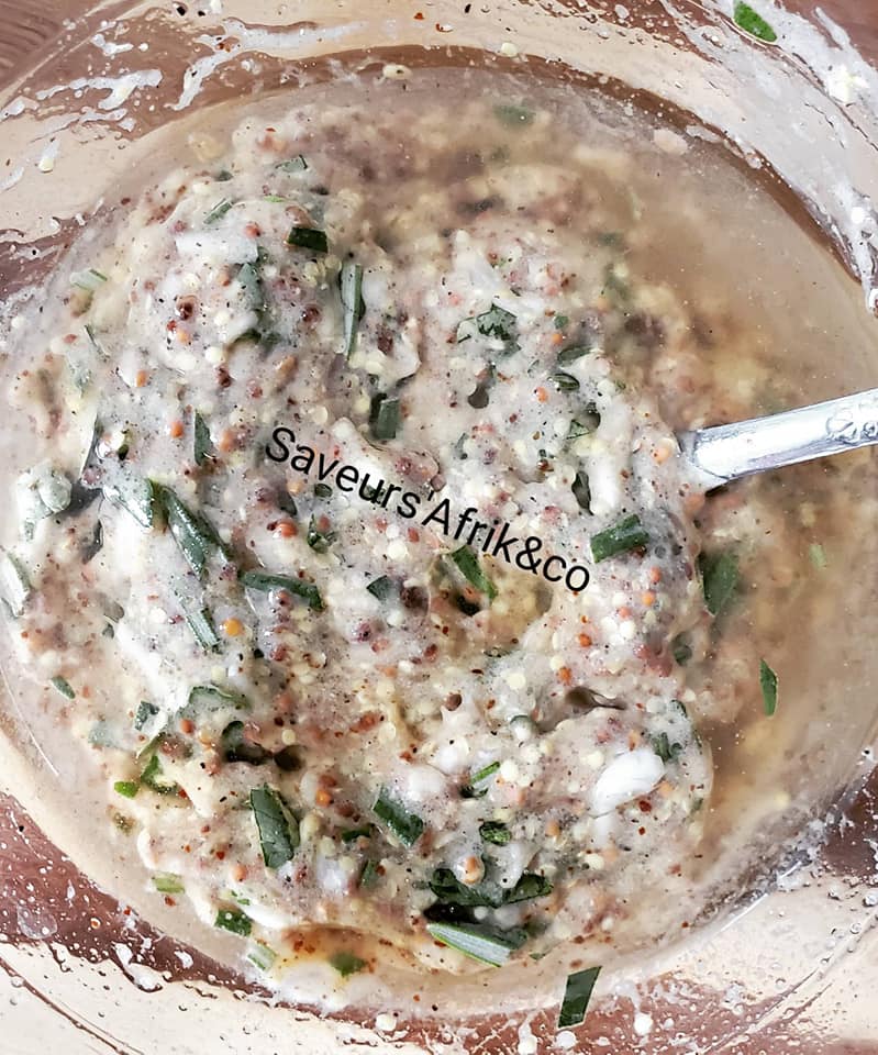 - Mélanger dans un bol 2 cuillères à café de graines de moutarde à l’ancienne, 1 cuillère à d’huile, l’ail haché, le poivre noir, gingembre, le vinaigre balsamique, le laurier et le romarin découpés petits morceaux.