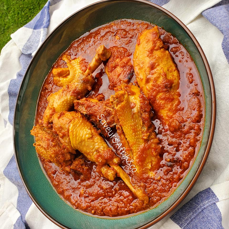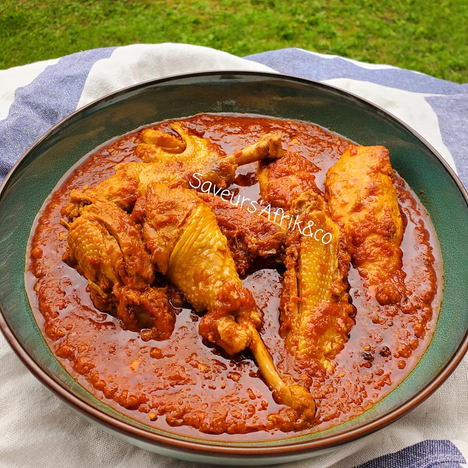 - Laver avec du citron et dégraisser votre poulet, puis les découper en morceaux. Mixer 3 gousses d’ail, 1 c.a.c de curry, gingembre, paprika, pèbè, jus de citron, 2 brins de persil, sel et poivre et mariner le poulet avec un partie de la marinade et réserver au frais pendant 1h. Puis faites bouillir pendant 10 min. Réserver le bouillon.