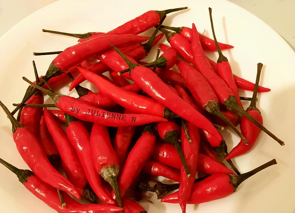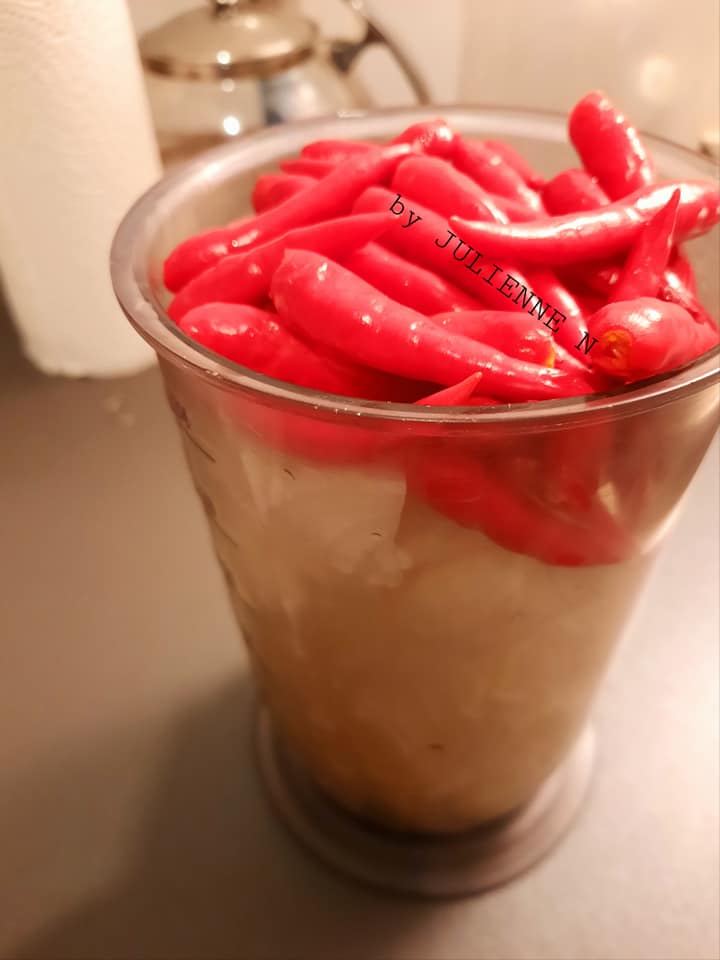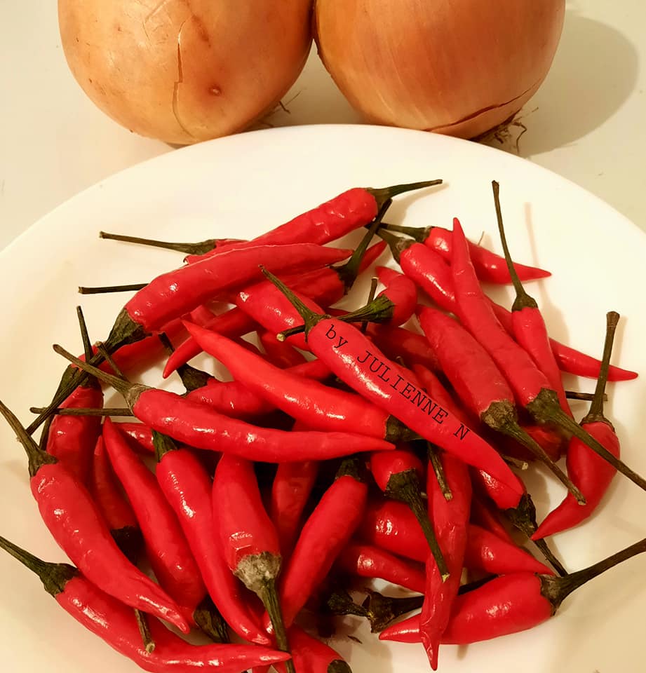 - Laver les piments à l’eau claire, débarrasser leurs tiges. Éplucher et couper les oignons.