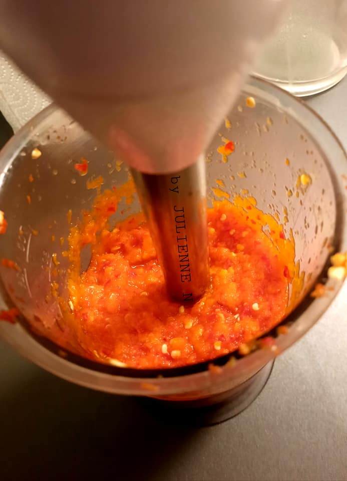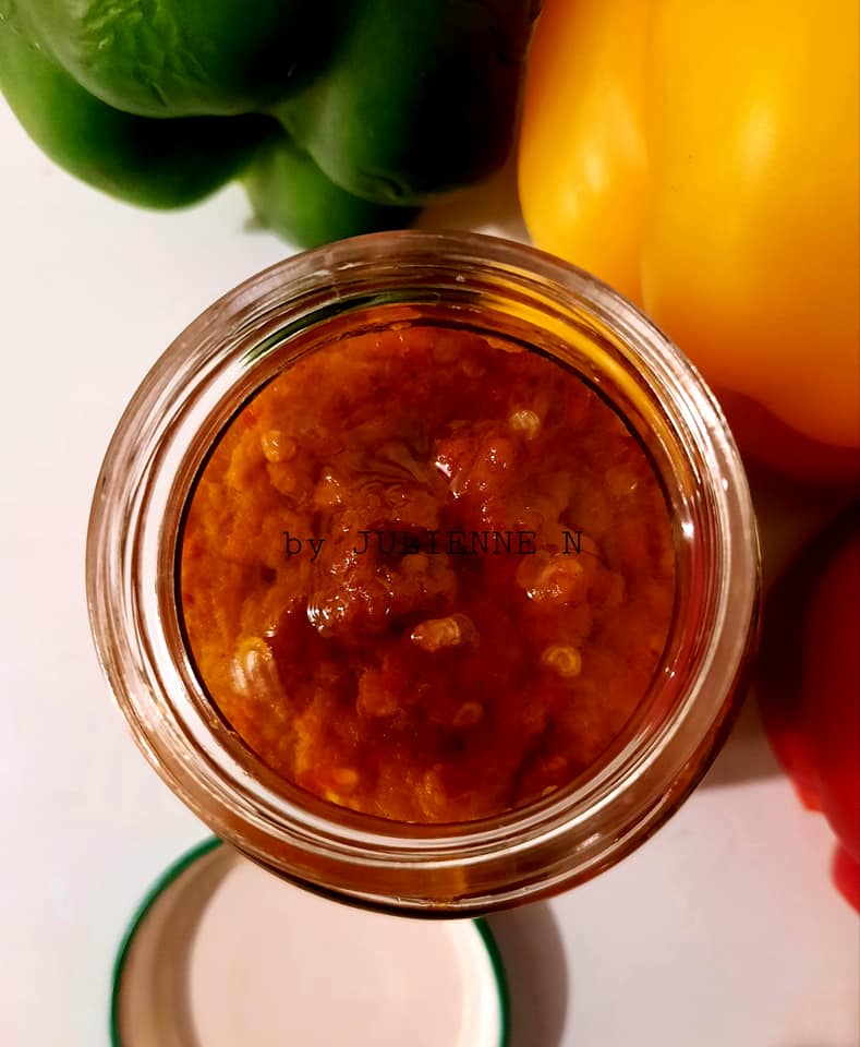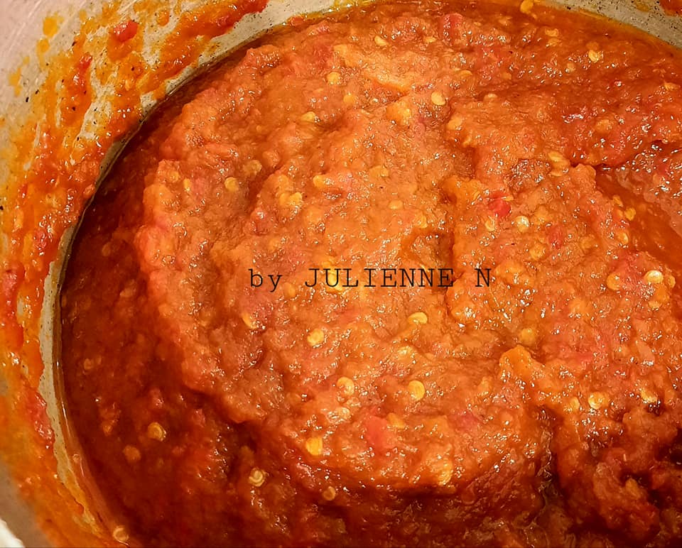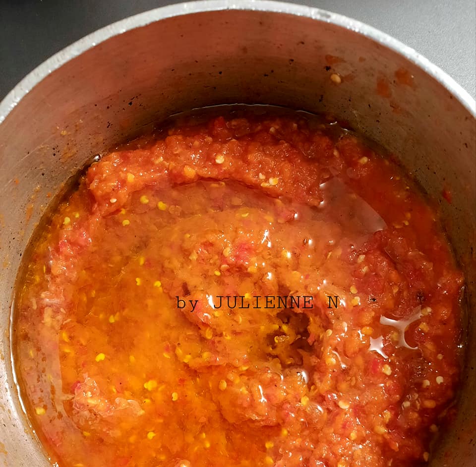 - Mettre la purée de piment obtenue dans un petit faitout, y ajouter 2 pincées de sel, 2 pincées de poivre, l’huile et porter à cuire sur un feu très très doux( thermostat 1), à couvert.