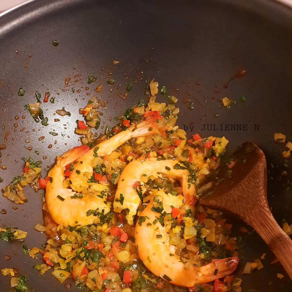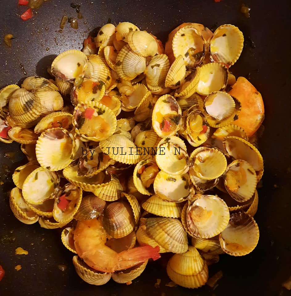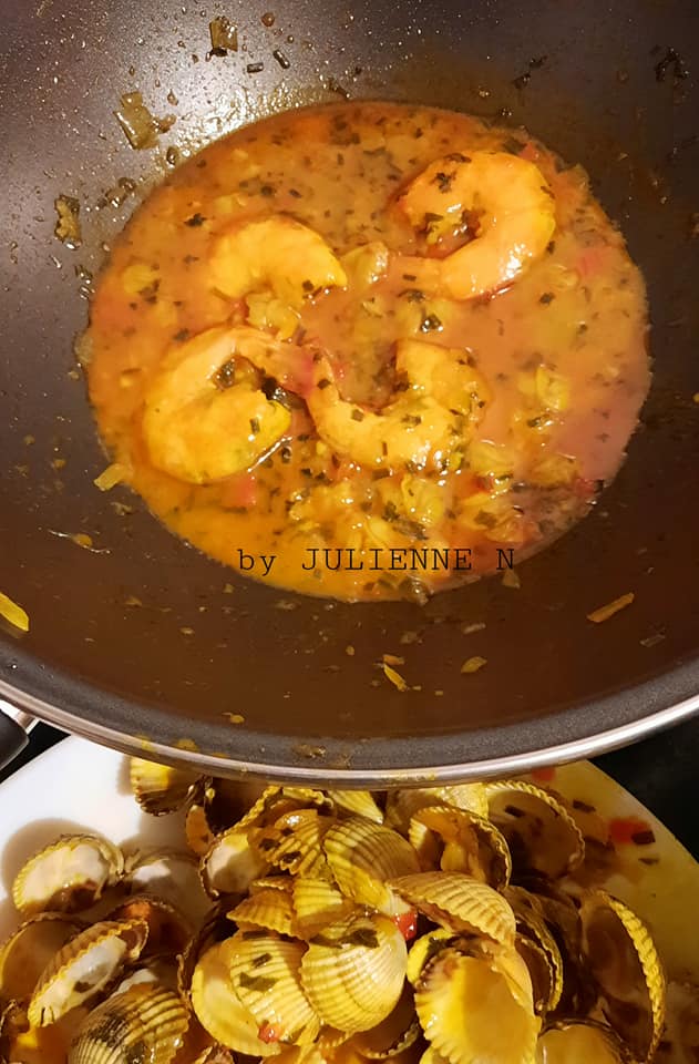 - Ajouter les fines herbes, ensuite les crevettes, les coques et laisser revenir encore 5 minutes.