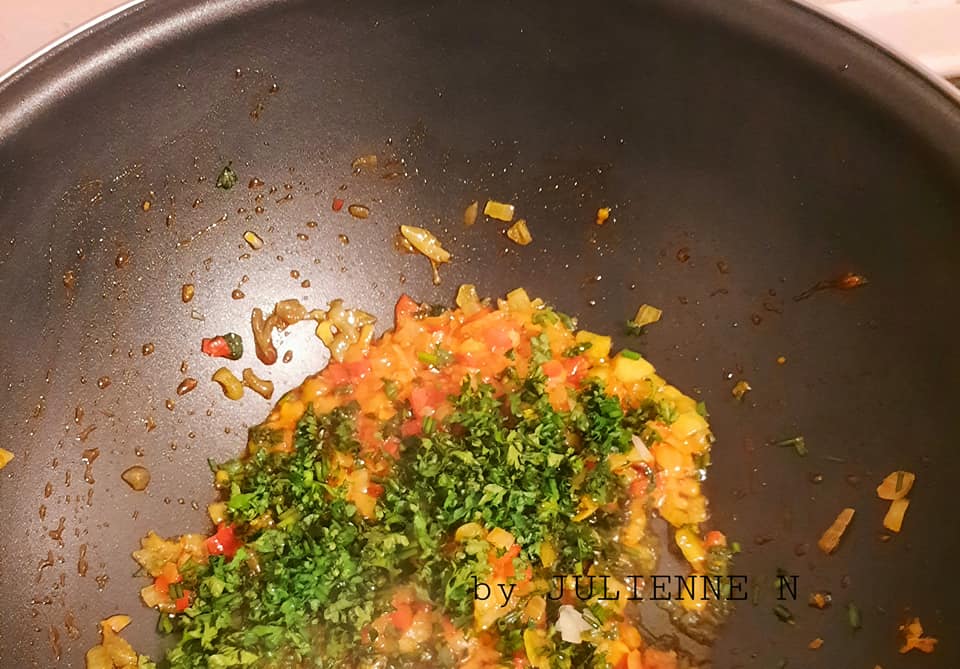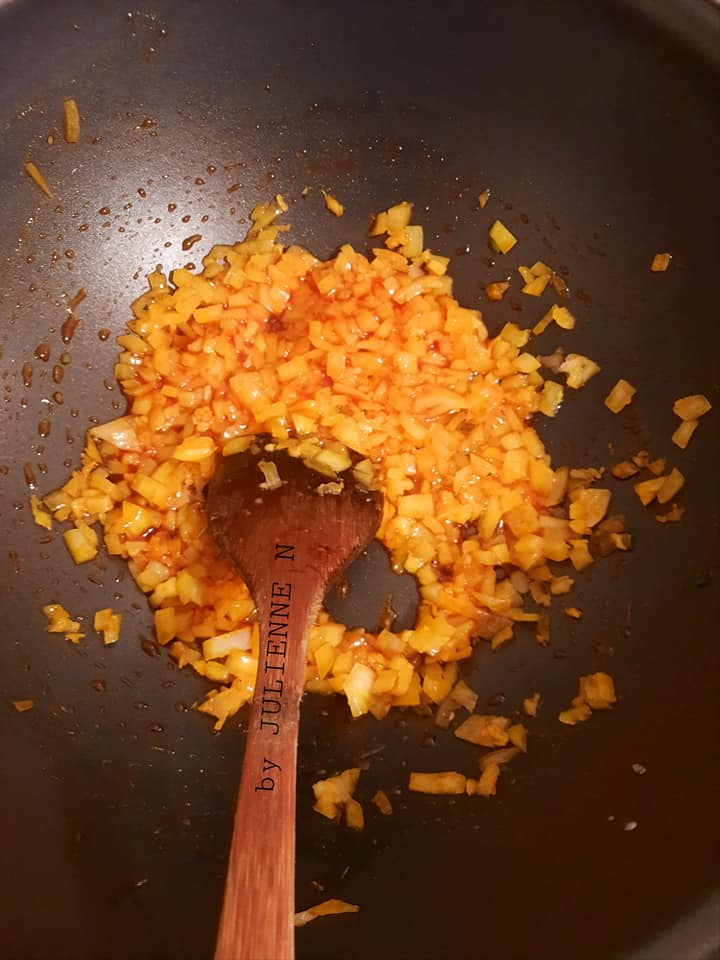 - À feu moyen, faire revenir l’oignon 2 minutes dans une cuillère à soupe et un demi d’huile de palme rouge. Ajouter l’ail écrasé au presse-ail, remuer 1 minute. Ajouter le poivron, et remuer 2 minutes.