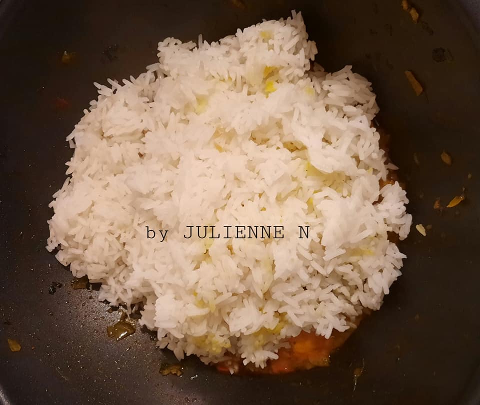 - Ajouter la quantité de riz blanc cuit, pour deux personnes et mélanger, jusqu’à absorption total du fond de sauce.