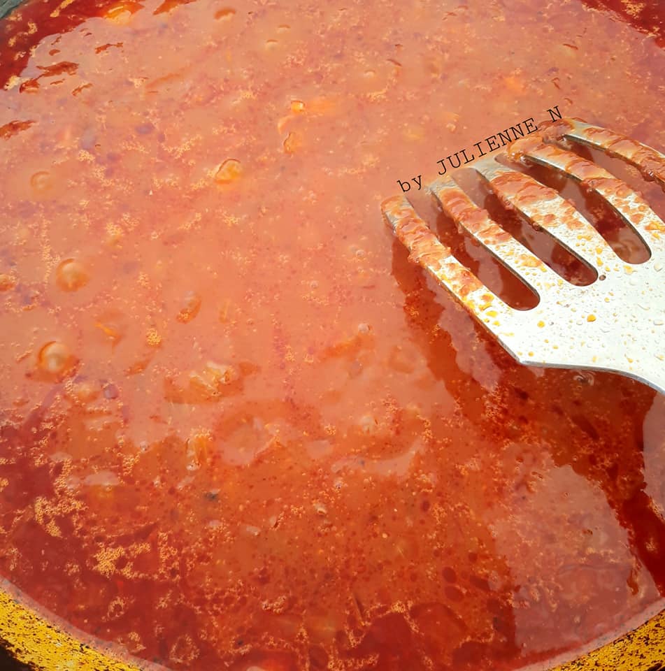 - Une fois le poisson frit, le réserver et vider l’huile végétale, de la poêle de friture. Y jeter les oignons, remuer 2 secondes puis ajouter la tomate concentré et l’huile de palme rouge. Remuer et laisser frire la tomate à feu vif, pendant 20 minutes, tout en continuant à remuer de temps à autre.