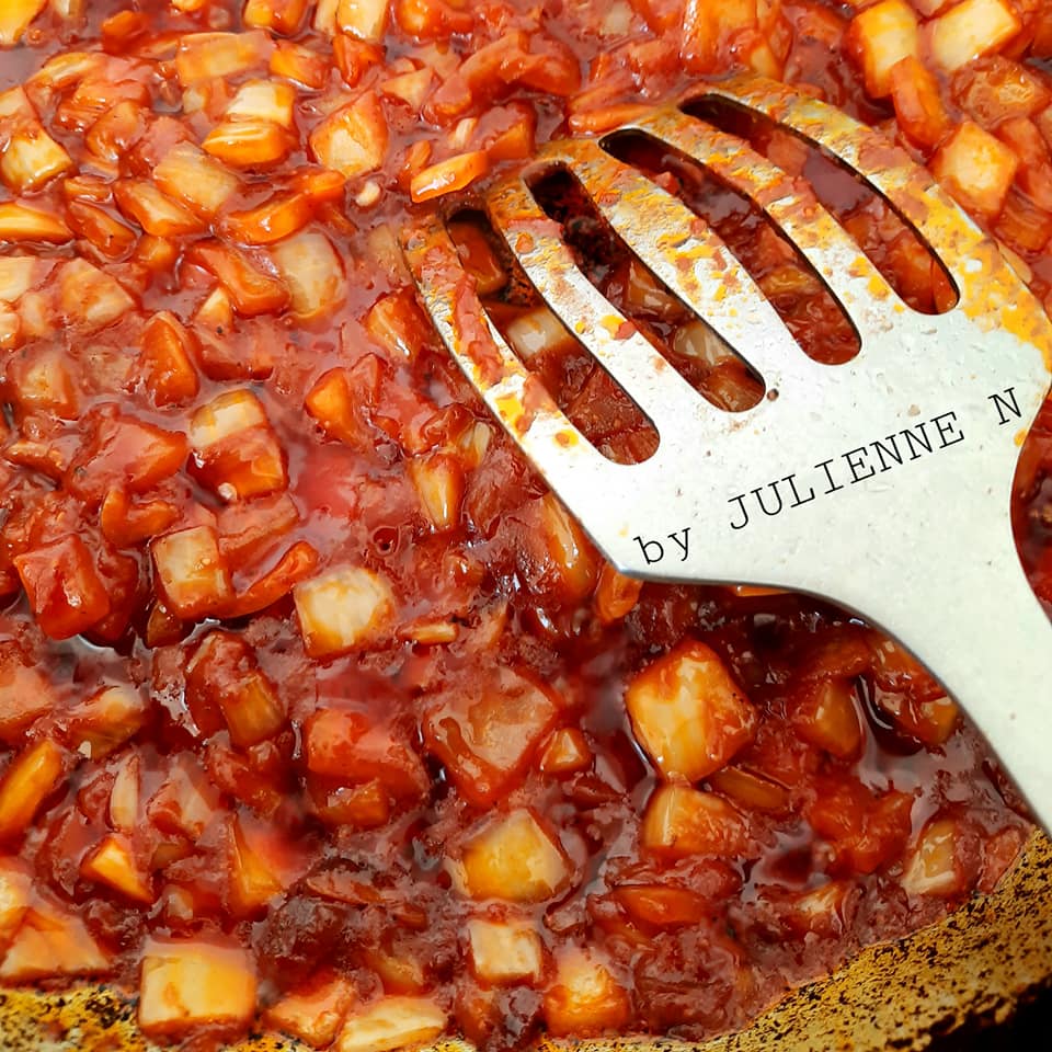 - Après 20 minutes, la tomate à bruni, elle est presque cuite. Alors, ajouter l’eau.