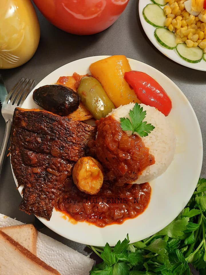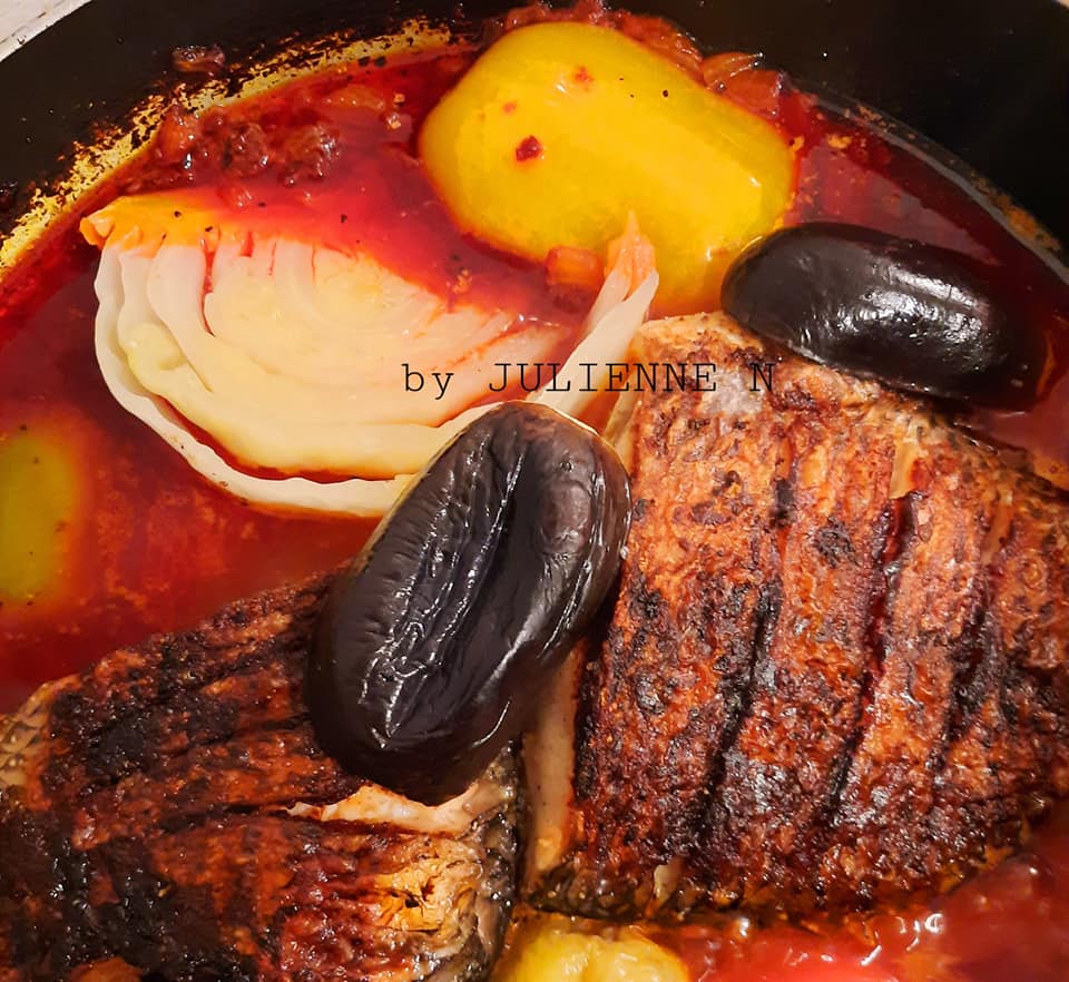 - Puis incorporer aussitôt, les légumes et le poisson et réduire complètement le feu ( thermostat 1) et finir la cuisson à feu très doux pendant encore 30 minutes. Rectifier l’assaisonnement et servir avec du riz blanc ou autre féculents de votre choix