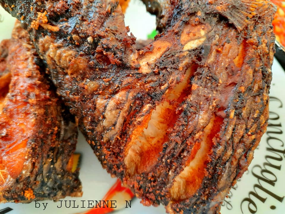 - Nettoyer le poisson, le mariner avec du sel, du poivre, de l’ail en poudre ou en purée et le faire frire dans une grande poêle avec l’huile végétale.