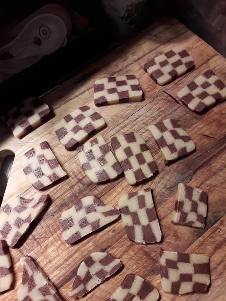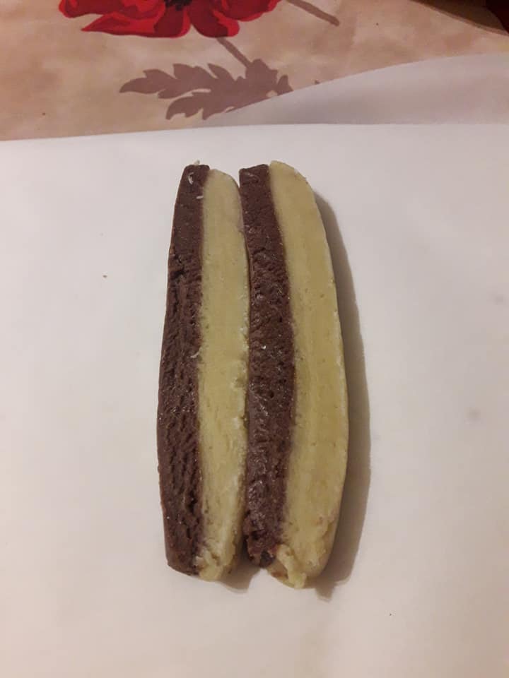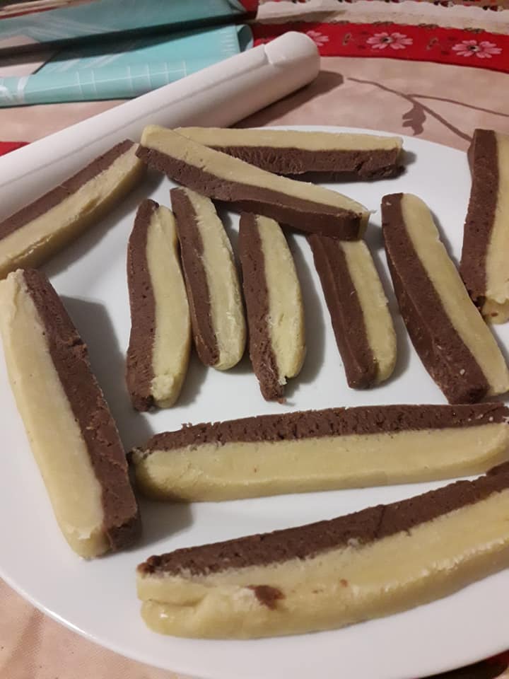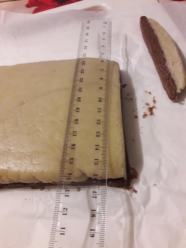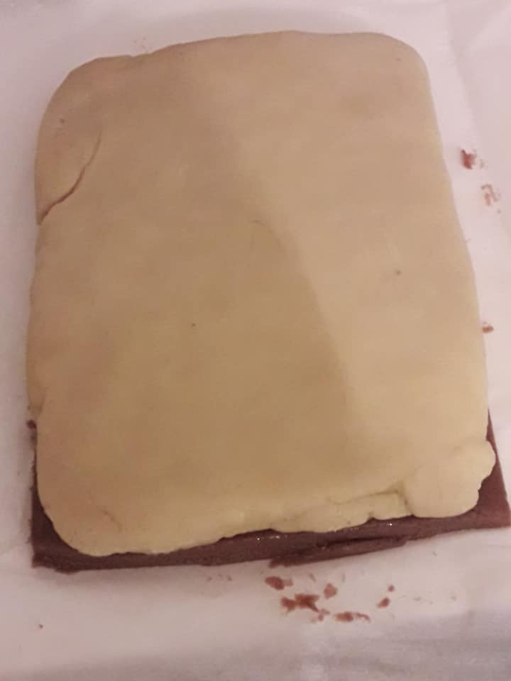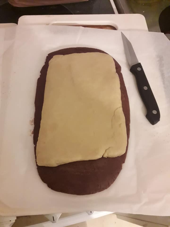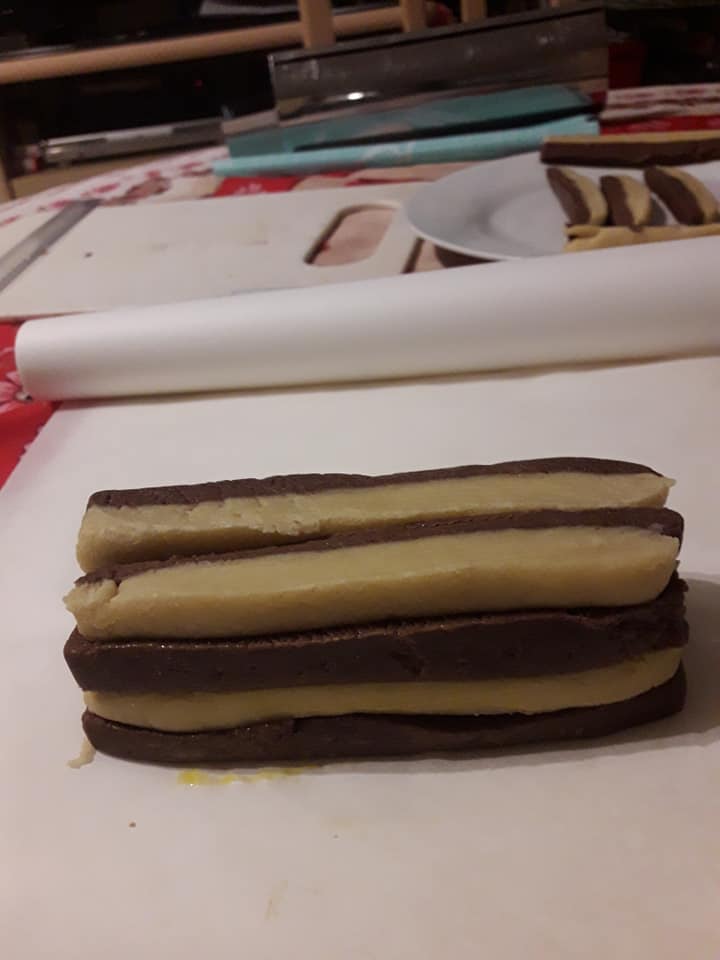 - Étaler votre pâte blanche pas trop épaisse en forme d’un rectangle, badigeonner le dessus de jaune d’œuf et étaler aussi la pâte matin à la même épaisseur et déposée sur la pâte blanche, appuyer légèrement, pour quelles se collent et laisser reposer 15 mn au frais sortir votre pâte et avec une règle découper des petits bâtonnet de 1cm d’épaisseur. Et coller les bâtonnets entre eux avec du jaune d’œuf, en prenant soin de diversifier les couches, ( donc du blanc sur le maron ainsi de suite