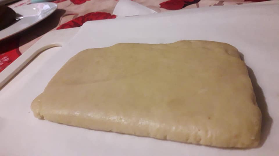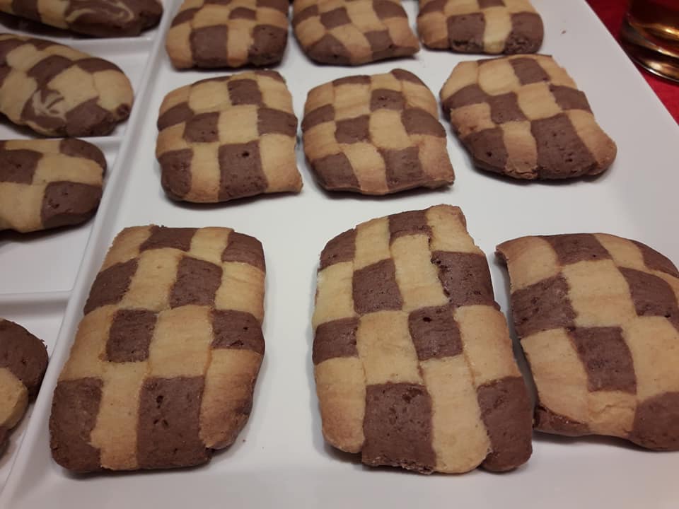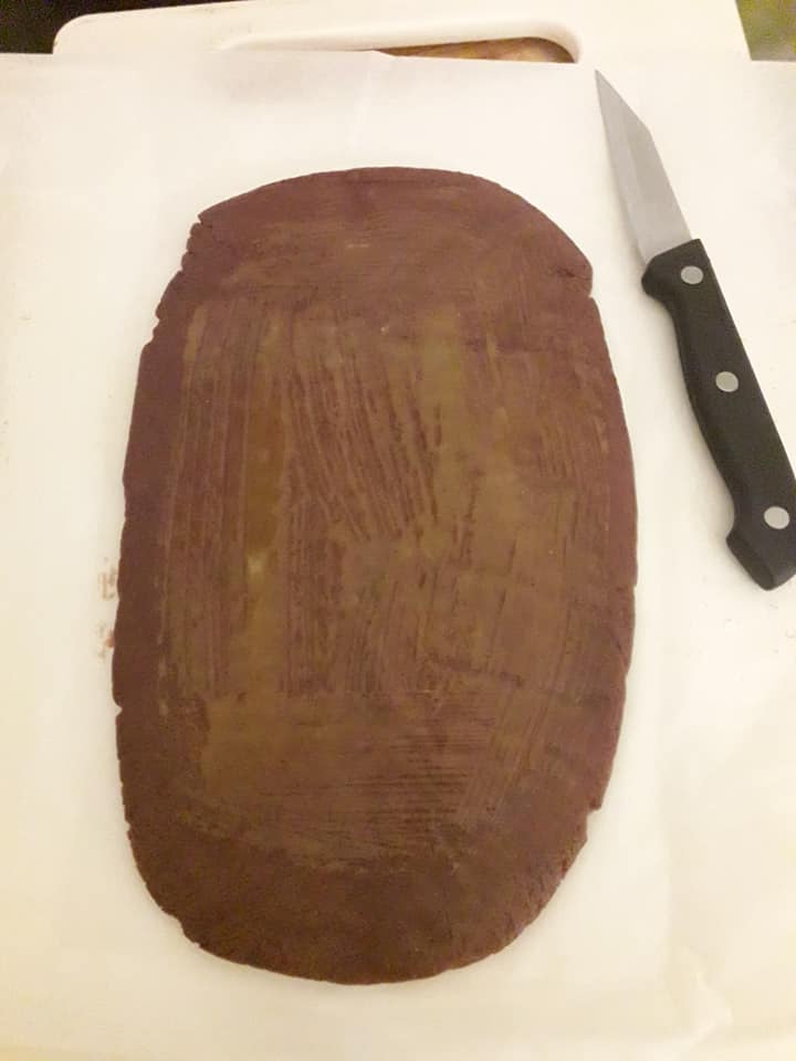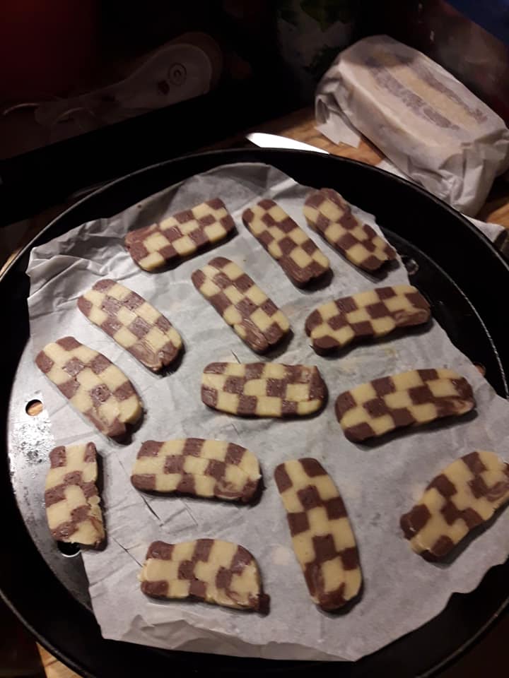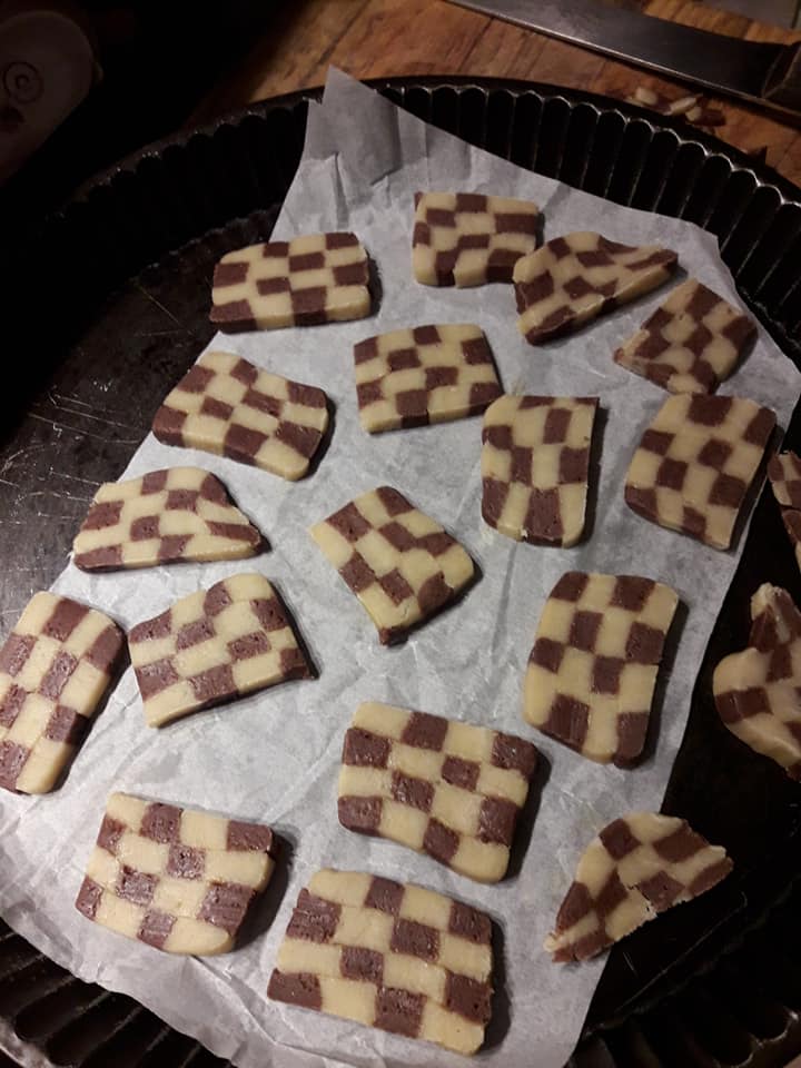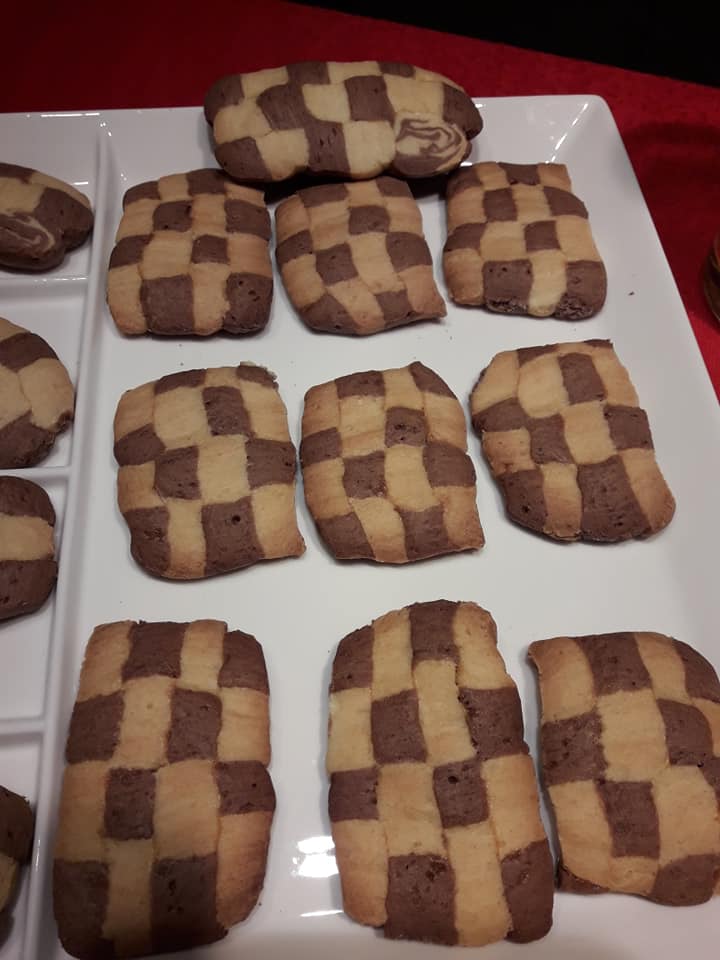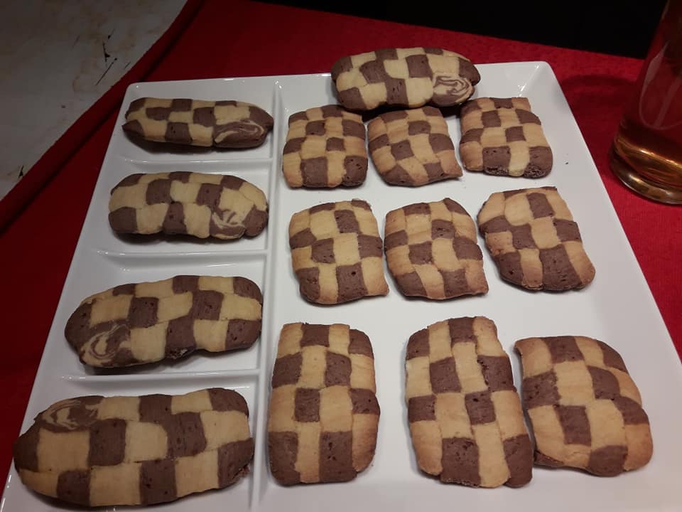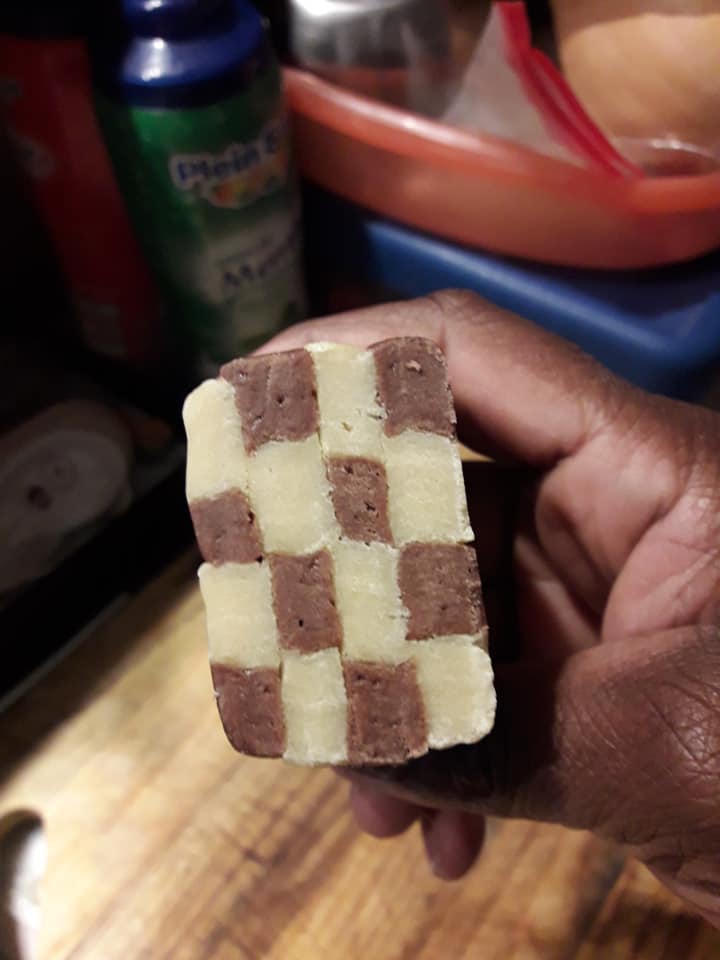 - Étaler votre pâte blanche pas trop épaisse en forme d’un rectangle, badigeonner le dessus de jaune d’œuf et étaler aussi la pâte matin à la même épaisseur et déposée sur la pâte blanche, appuyer légèrement, pour quelles se collent et laisser reposer 15 mn au frais sortir votre pâte et avec une règle découper des petits bâtonnet de 1cm d’épaisseur. Et coller les bâtonnets entre eux avec du jaune d’œuf, en prenant soin de diversifier les couches, ( donc du blanc sur le maron ainsi de suite