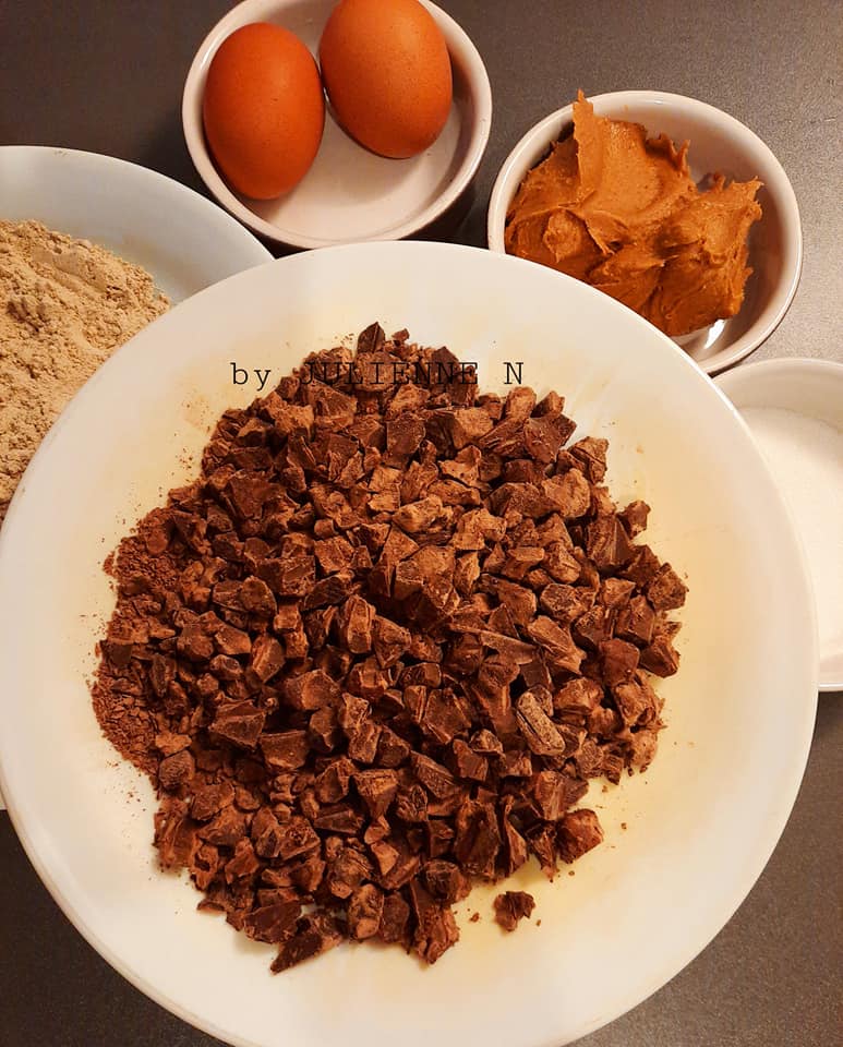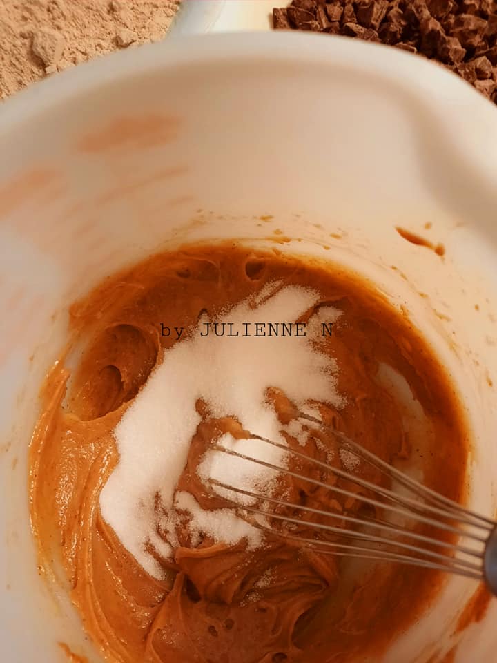 - Dans un saladier, battre la pâte d’arachide avec les œufs, jusqu’à obtenir une pâte homogène, à l’aide d’un fouet.