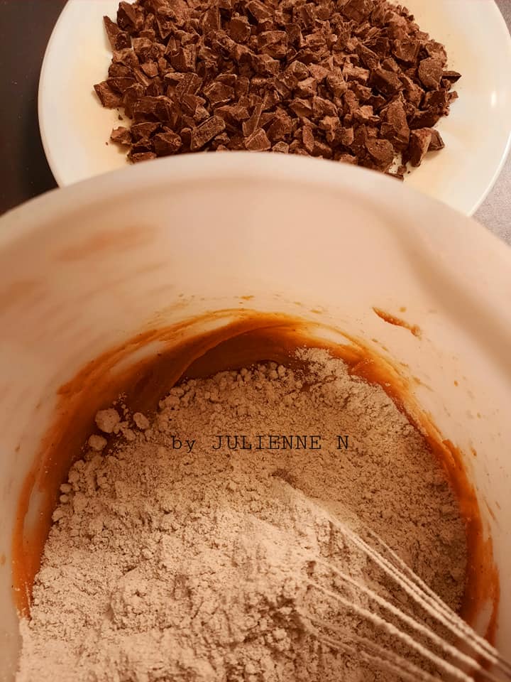 - Ensuite, ajouter la farine et mélanger. Lorsque la pâte est homogène, incorporer, dans cette dernière, les morceaux de chocolat ou les pépites.