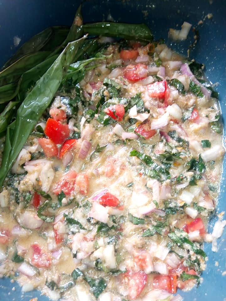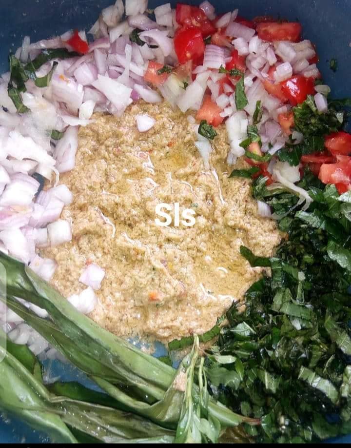 - Découper 1oignon 2tomates ainsi que le reste des feuilles de massep et de koti. Mélanger aux condiments écrasés et y ajouter 3cs d’huile raffinée et demi tasse d’eau ou plus si c’est à la pierre pour avoir un peu de sauce. Saler le mélange.