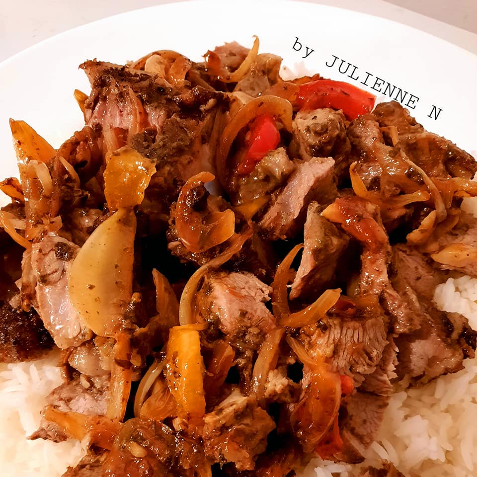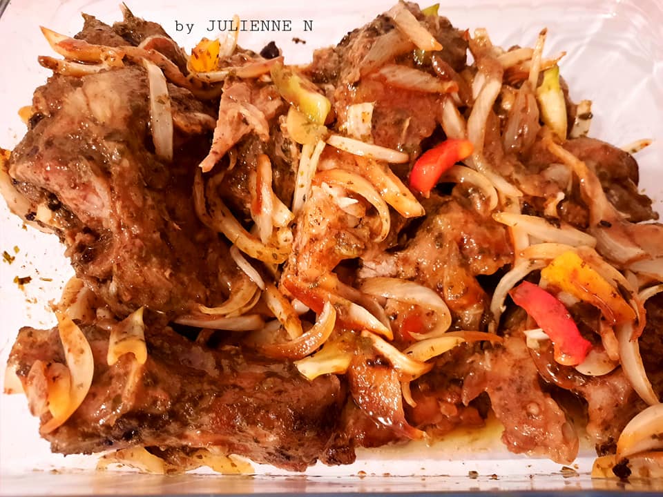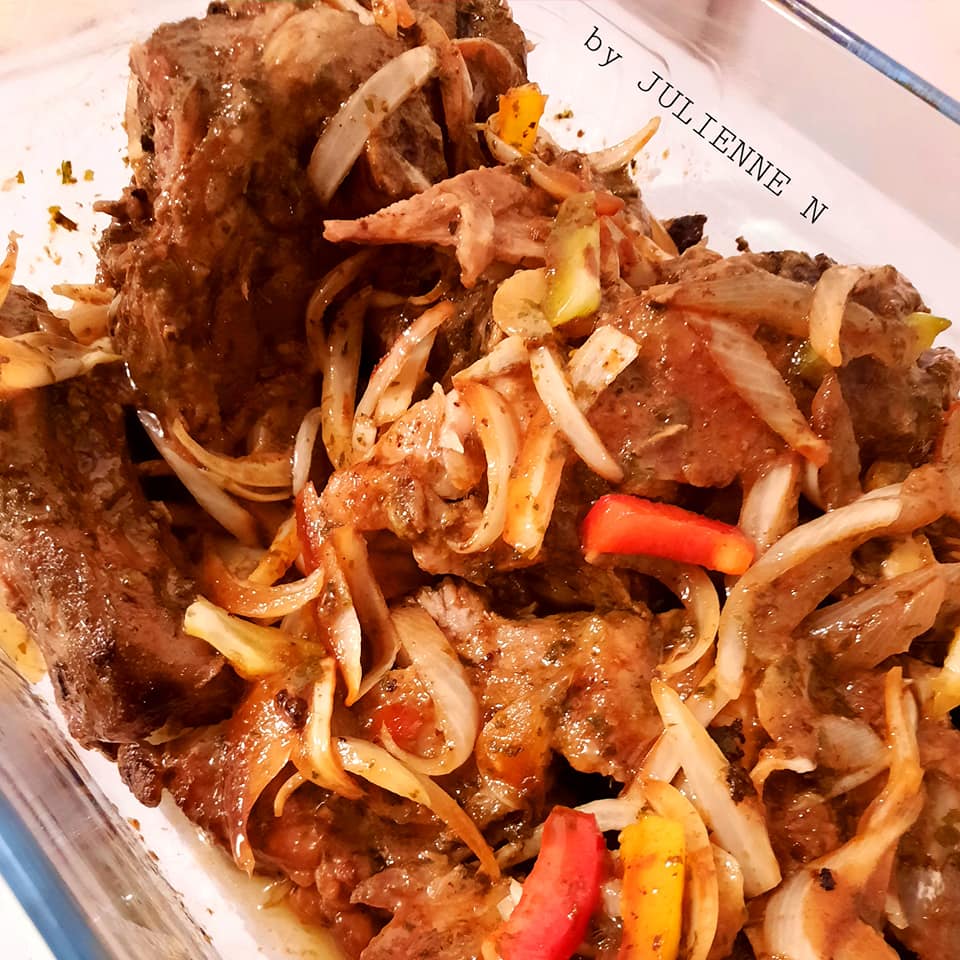 - Poser la viande, mettre les lamelles d’oignon entre les tranches de l’épaule et le jus de marinade, en laissant un petit fond de jus de marinade pour l’oignon et la demie, le poivron, à rajouter 10 minutes avant la fin de cuisson.
