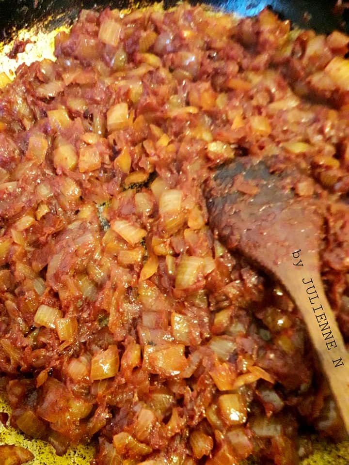 - Y caraméliser les oignons avec la tomate pendant 30 minutes à feu vif toujours.