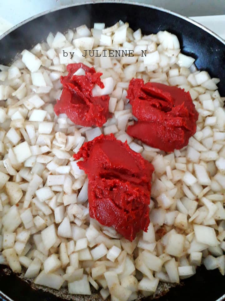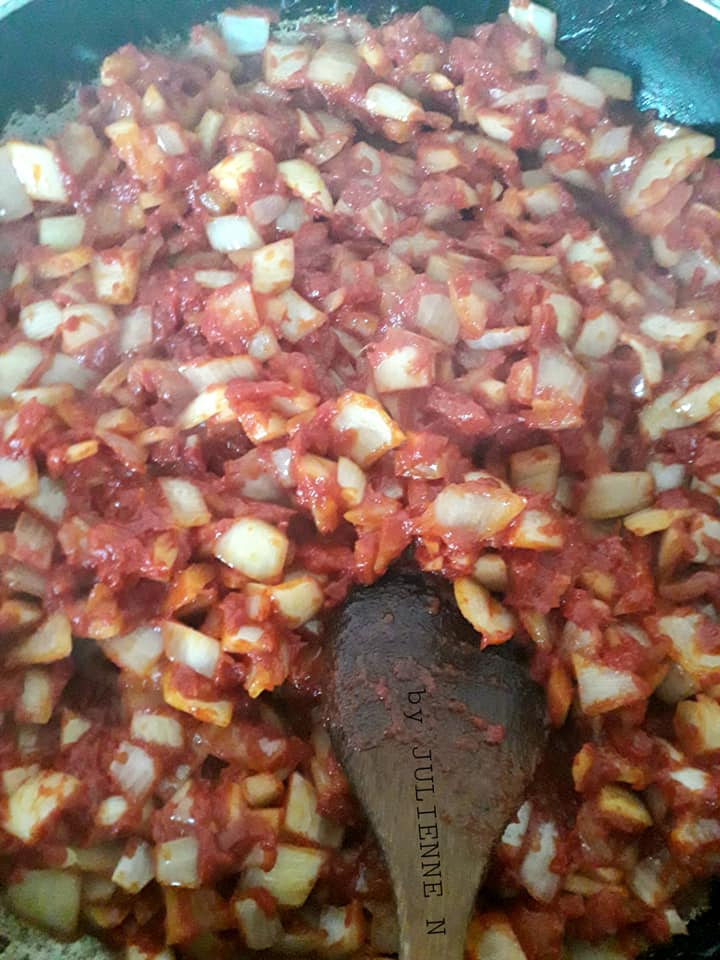 - La tomate et les oignons cuits, y ajouter, sur le côté de la poêle, 50 cl d’eau et laisser mijoter 15 minutes à feu très doux, en prenant soins de vérifier l’assaisonnement.