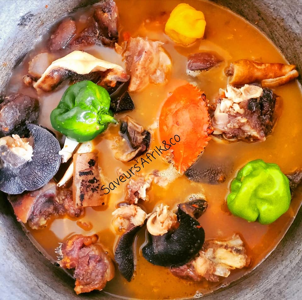 - Nettoyer l’escargot avec une pâte de manioc pour enlever le gluant et dans une marmite faire bouillir avec un peu de sel et d’eau pendant 15min. Puis, ajouter les autres protéines nettoyés et découpés: crabes, pklo, viandes de bœuf, pattes de bœuf et un demi oignon découpé.