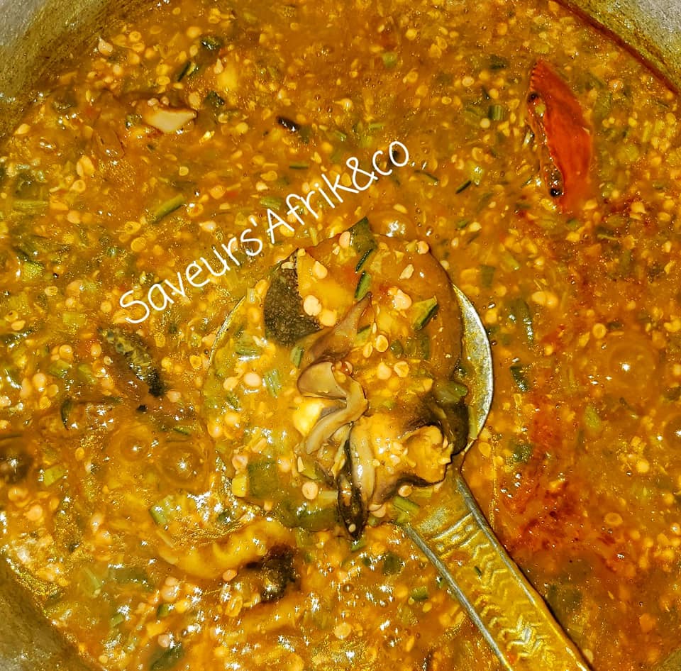 - Laisser bouillir pendant 15 min à découvert en remuant régulièrement à l’aide d’un écumoire. Ajouter une louche de sauce claire et rectifier l’assaisonnement. Une fois la sauce gombo cuite, laisser refroidir et fouetter la sauce à l’aide d’un écumoire.