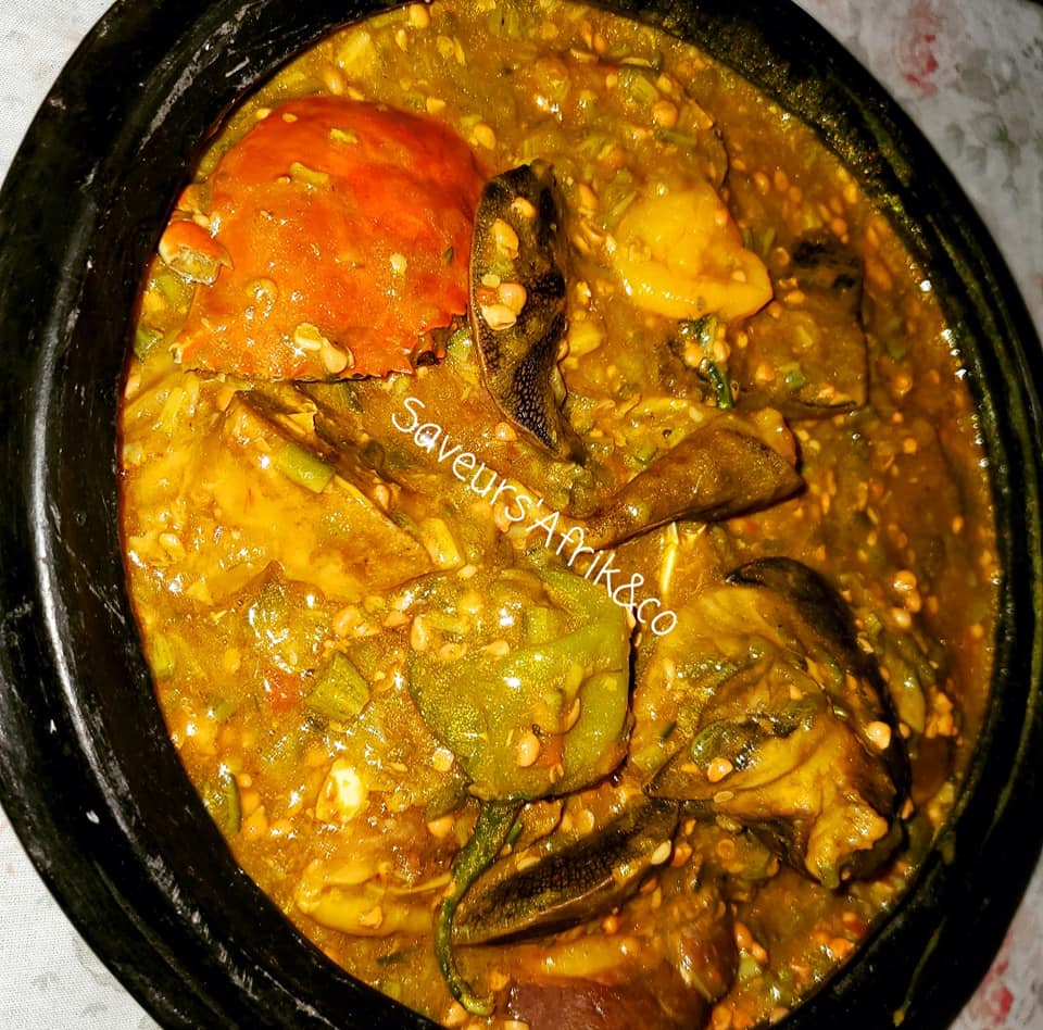 - Enfin, bien mélanger les deux sauces et ajouter le poisson émietté, les crevettes séchées en poudre et un peu d’huile rouge si nécessaire : sauce gombo et la première sauce et laisser mijoter 10 min. C’est prêt.