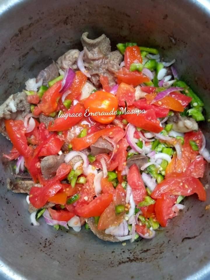 - Une fois que l’eau sorti de la viande est séchée, mettez de l’eau ,du sel,de l’huile et les épices de votre choix.