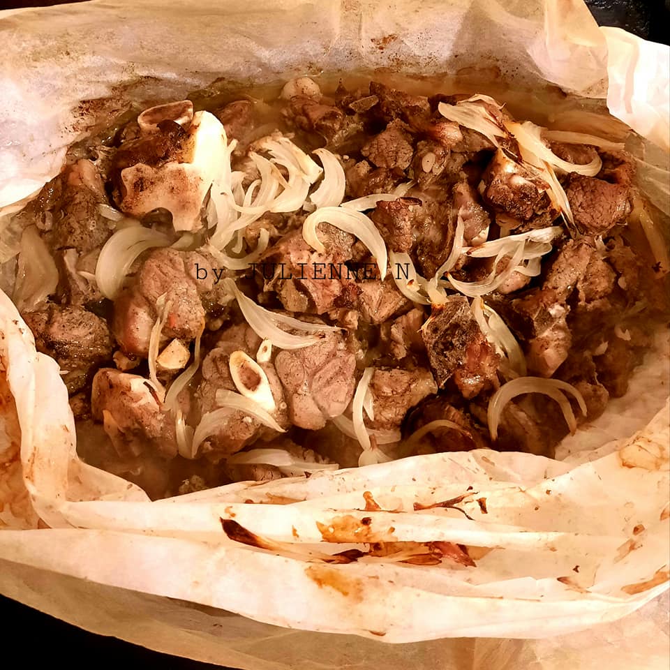- Étaler le papier sulfurisé sur la plaque de cuisson du four et y ajouter le ¼ d’un oignon coupé en lamelles. Poser par-dessus la moitié de la viande et ajouter encore le ¼ de l’oignon, puis recouvrir du reste de la viande. Ajouter la moitié du demi oignon restant, au-dessus de la viande et fermer bien le papier cuisson.